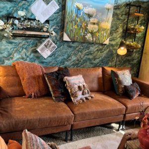 bruin cognac, links 3.20 breed rechterdeel 1.90 breed, BRIK Group, elementen bank met lounge eiland, zwart ijzeren poot, bekleding Essenza leer 05 geïmpregneerd tegen vuil en vlekken, geruwd hierdoor voelt het zacht, aan warm in de winter, koel in de zomer ( op voorraad ) V1