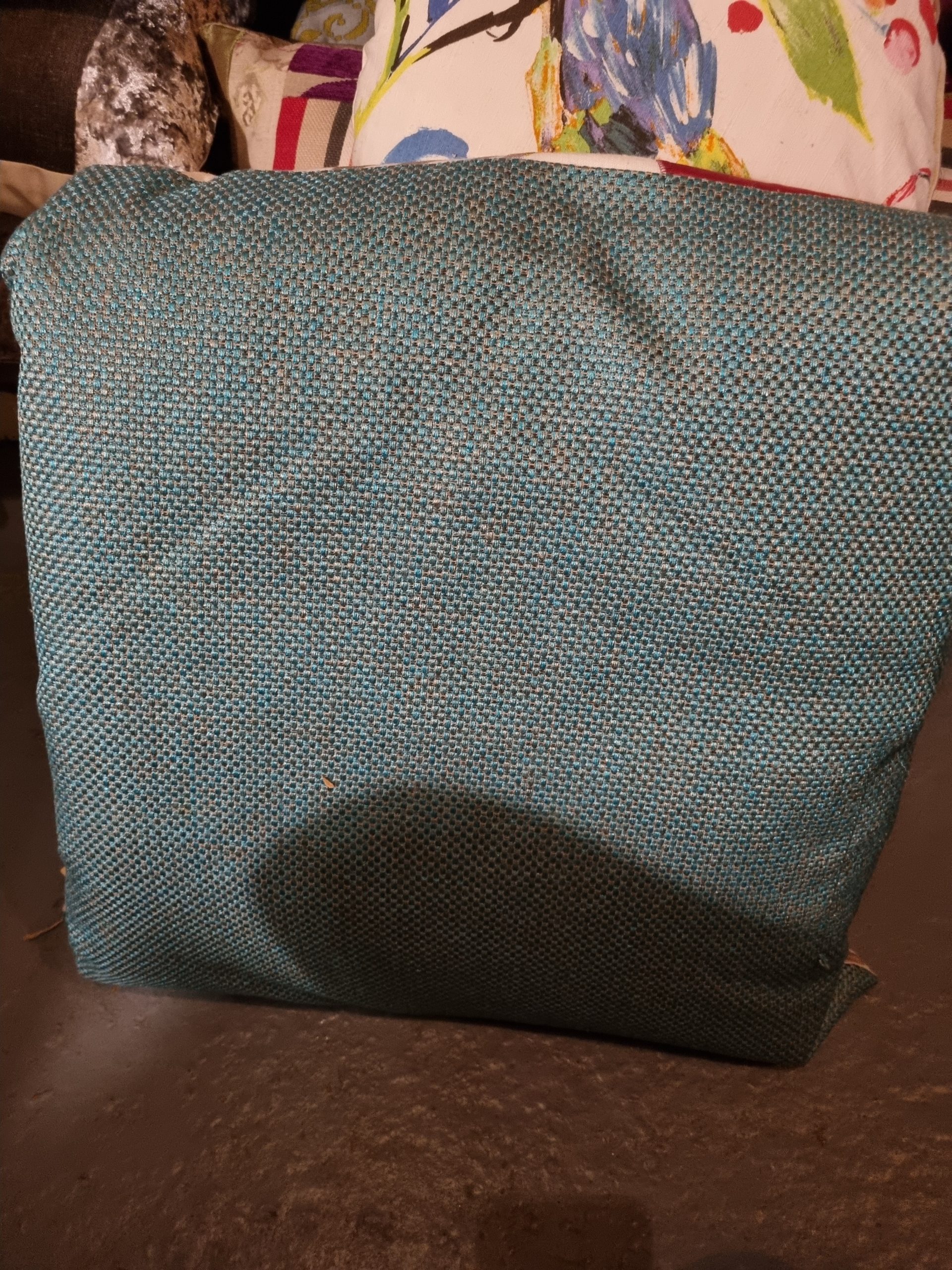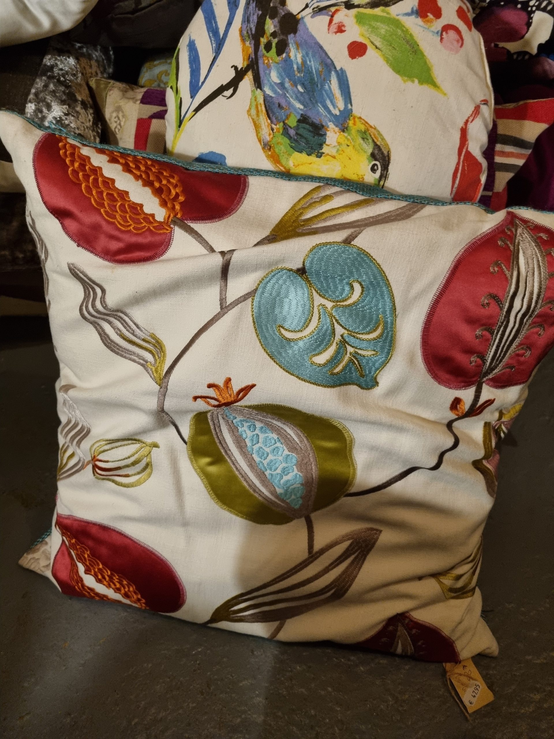 Blauw rood groen beige kussen met bloemen, hand gemaakt uniek 60x60cm vierkant, M.M. Metamorphosis, Achterkant blauw, incl. binnen kussen (op voorraad) V1