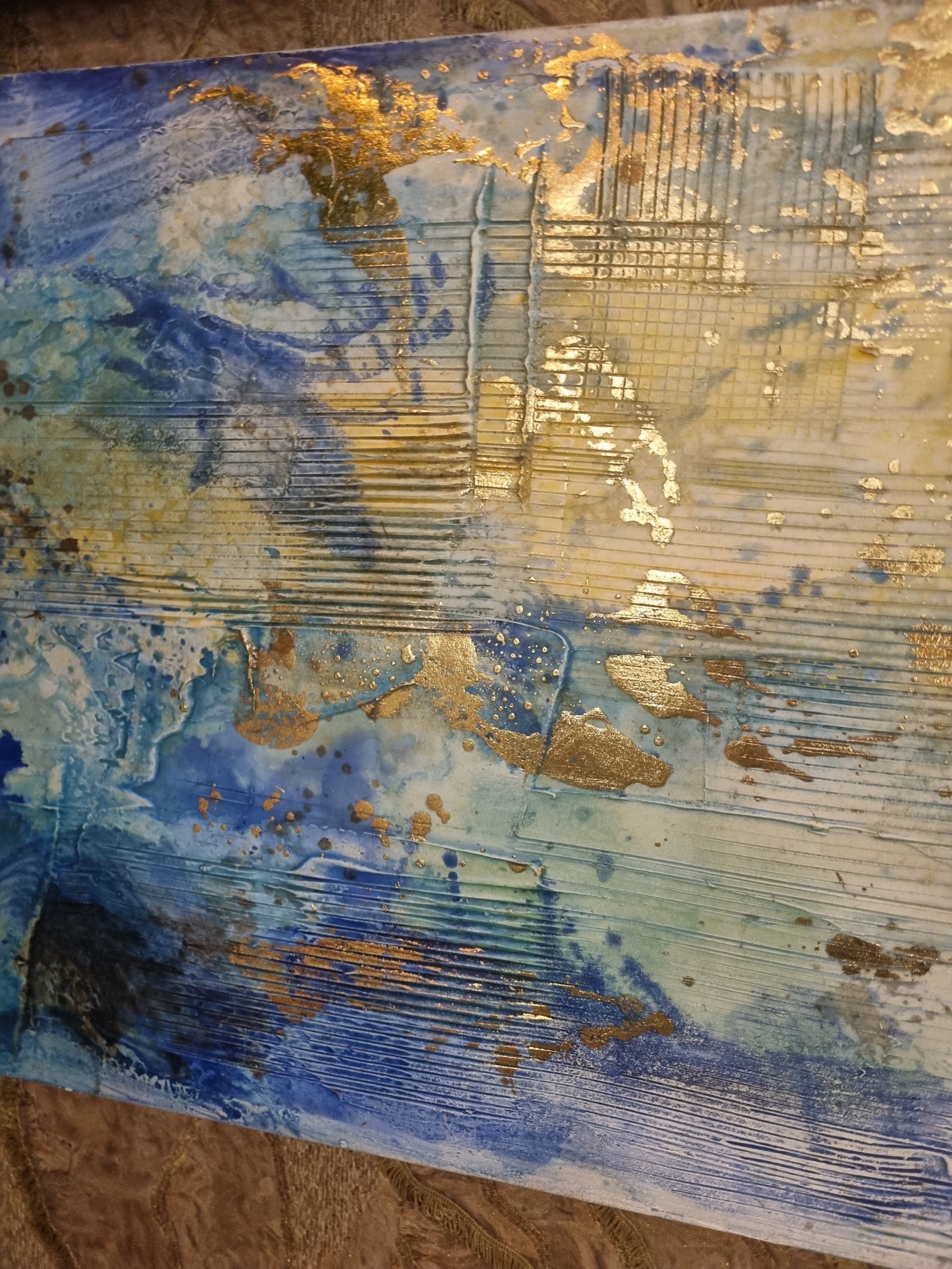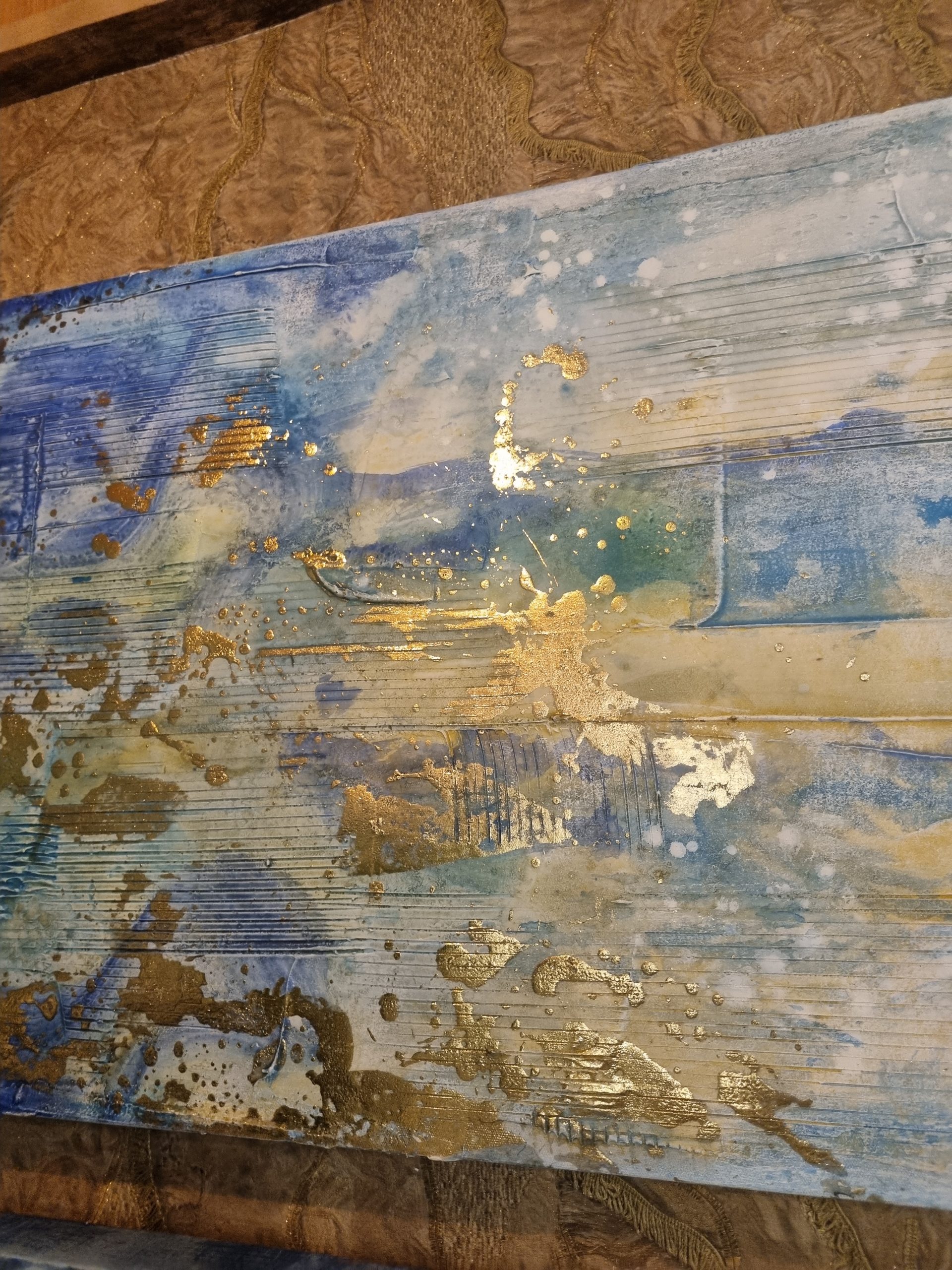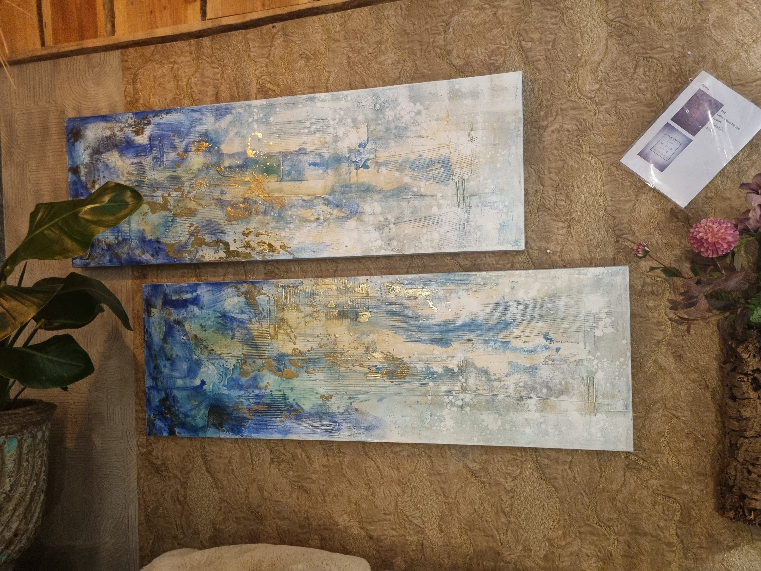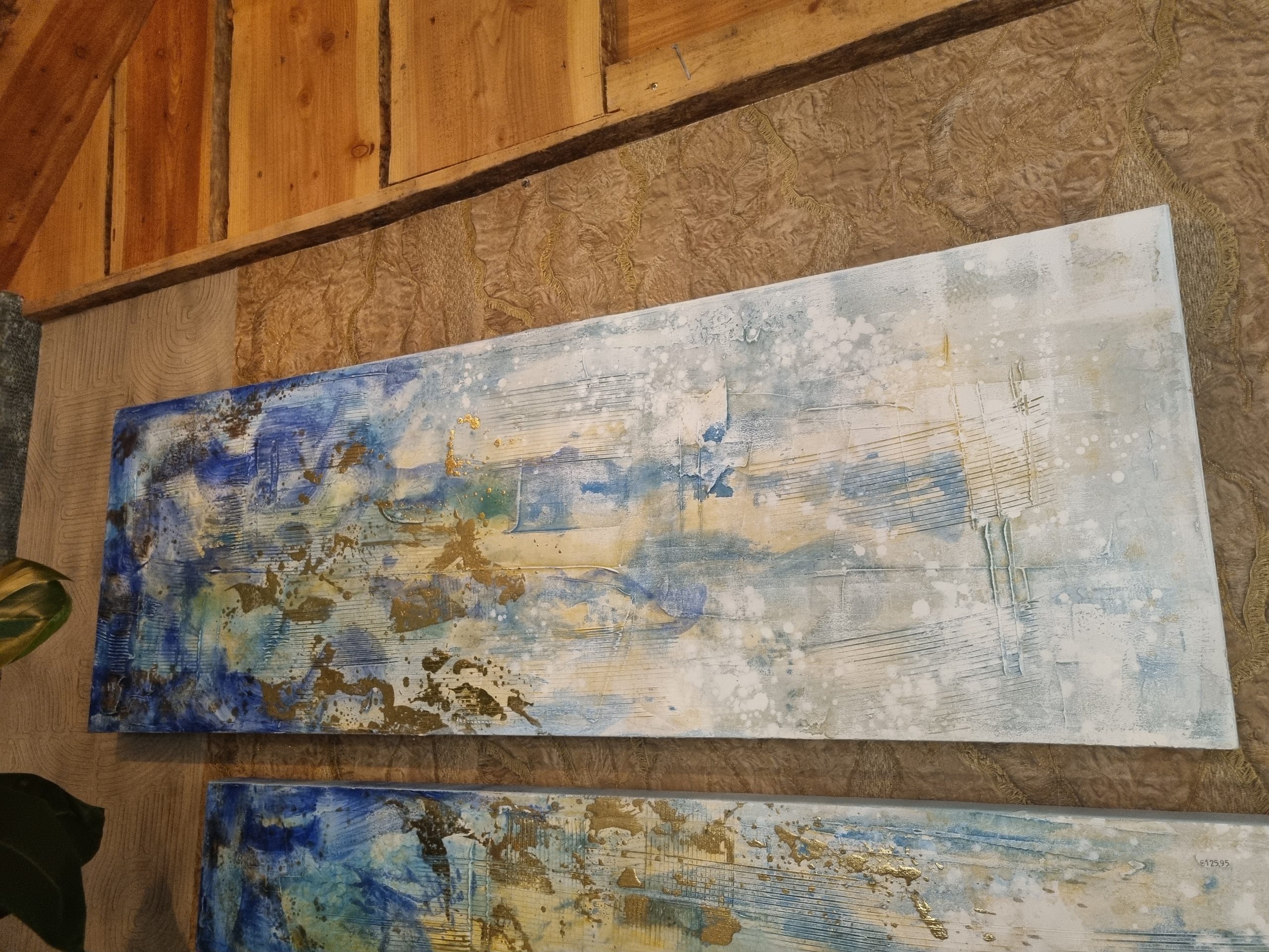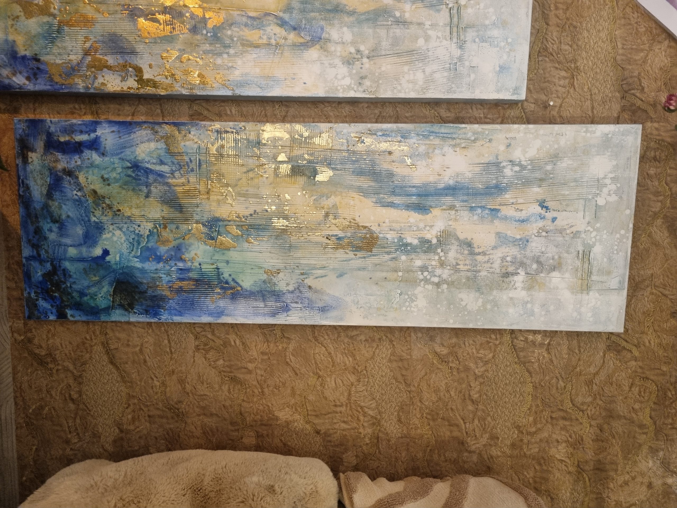 Blauw wit goud olie verf op doek uniek set van 2, Ter Halle, 50x150cm, langwerpig, Kunnen verticaal en horizontaal opgehangen worden. Ook apart verkrijgbaar ( op voorraad ) v1