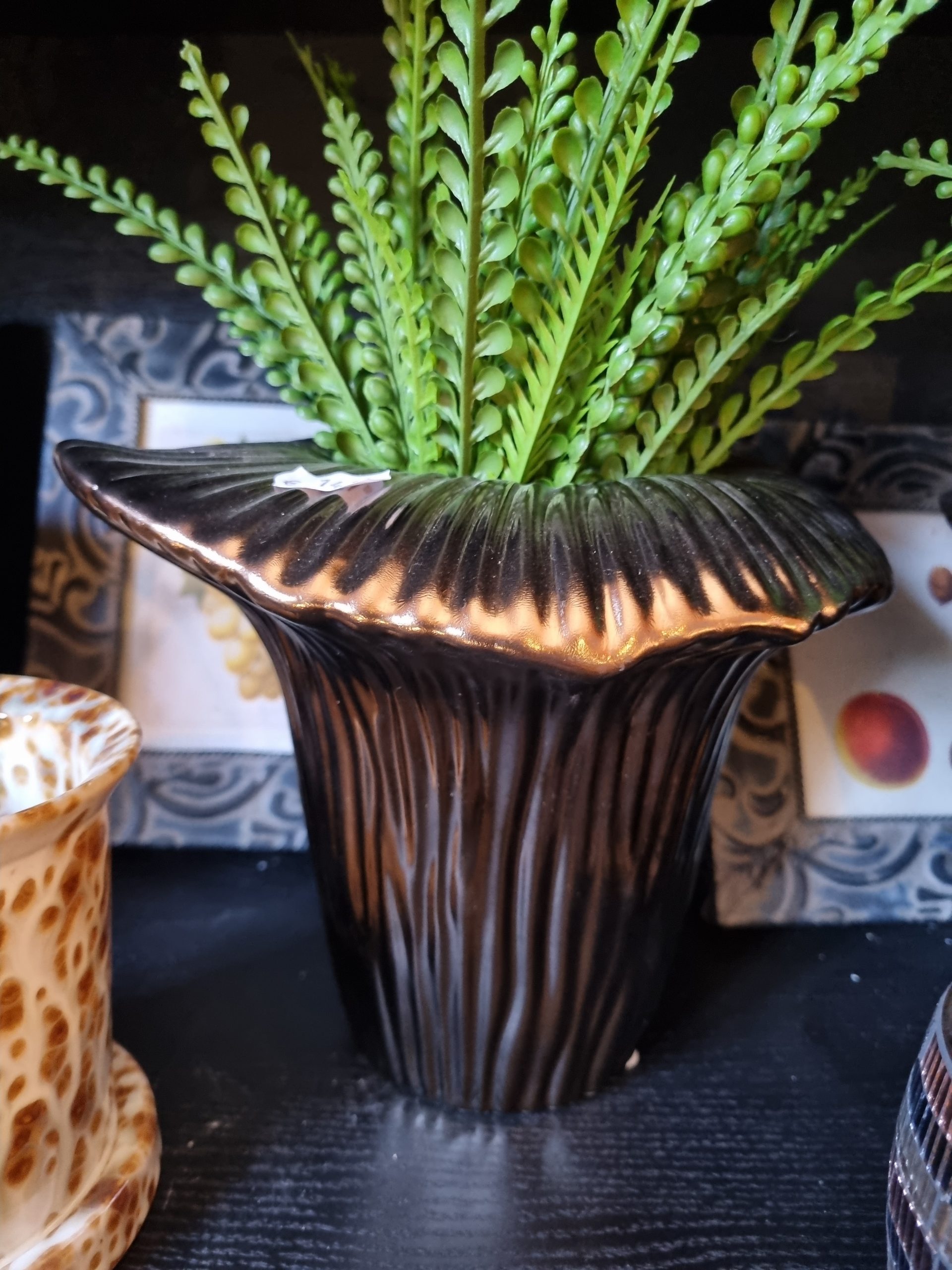 Bruin brons aardewerk geglazuurd plant pot bloem vaas organische vorm, Waterdrinker, rond Ø21 x 18 hoog cm. (op voorraad) V3