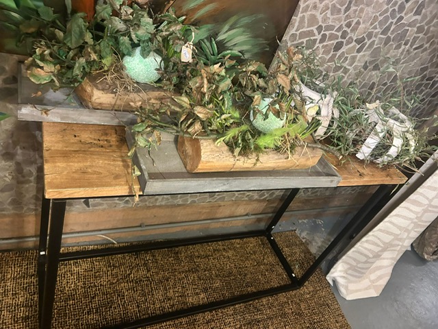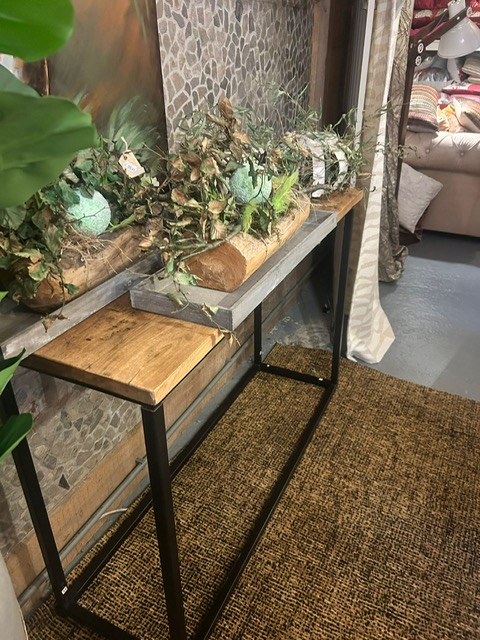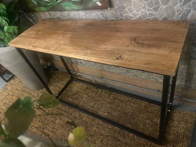 Bruin houten tafel bureau- hal- wandtafel met zwart metaal onderstel, Hoogedam, 40 cm lang x 1.20 m diep x Hoog 81.5cm (op voorraad) V1