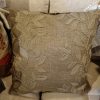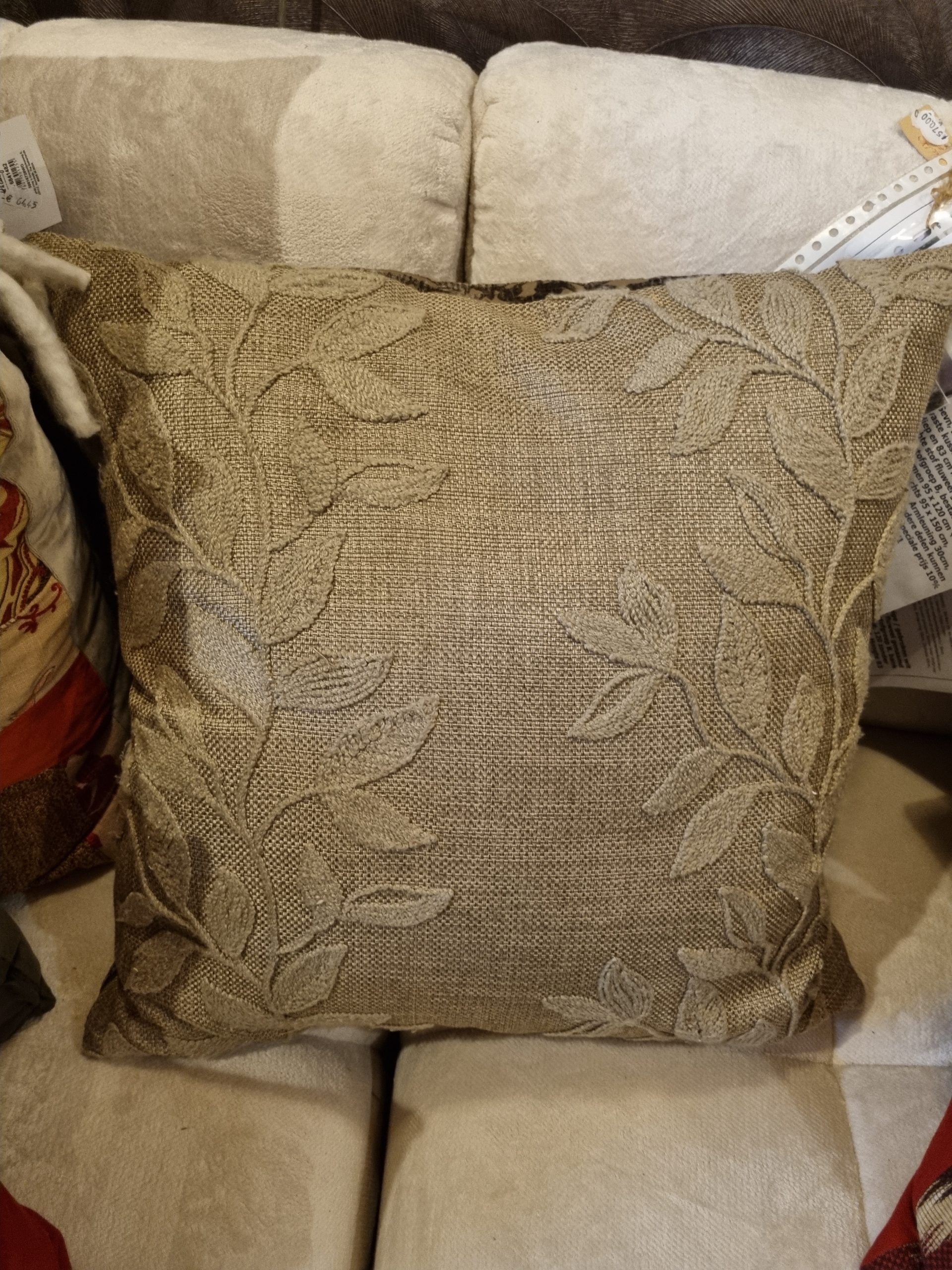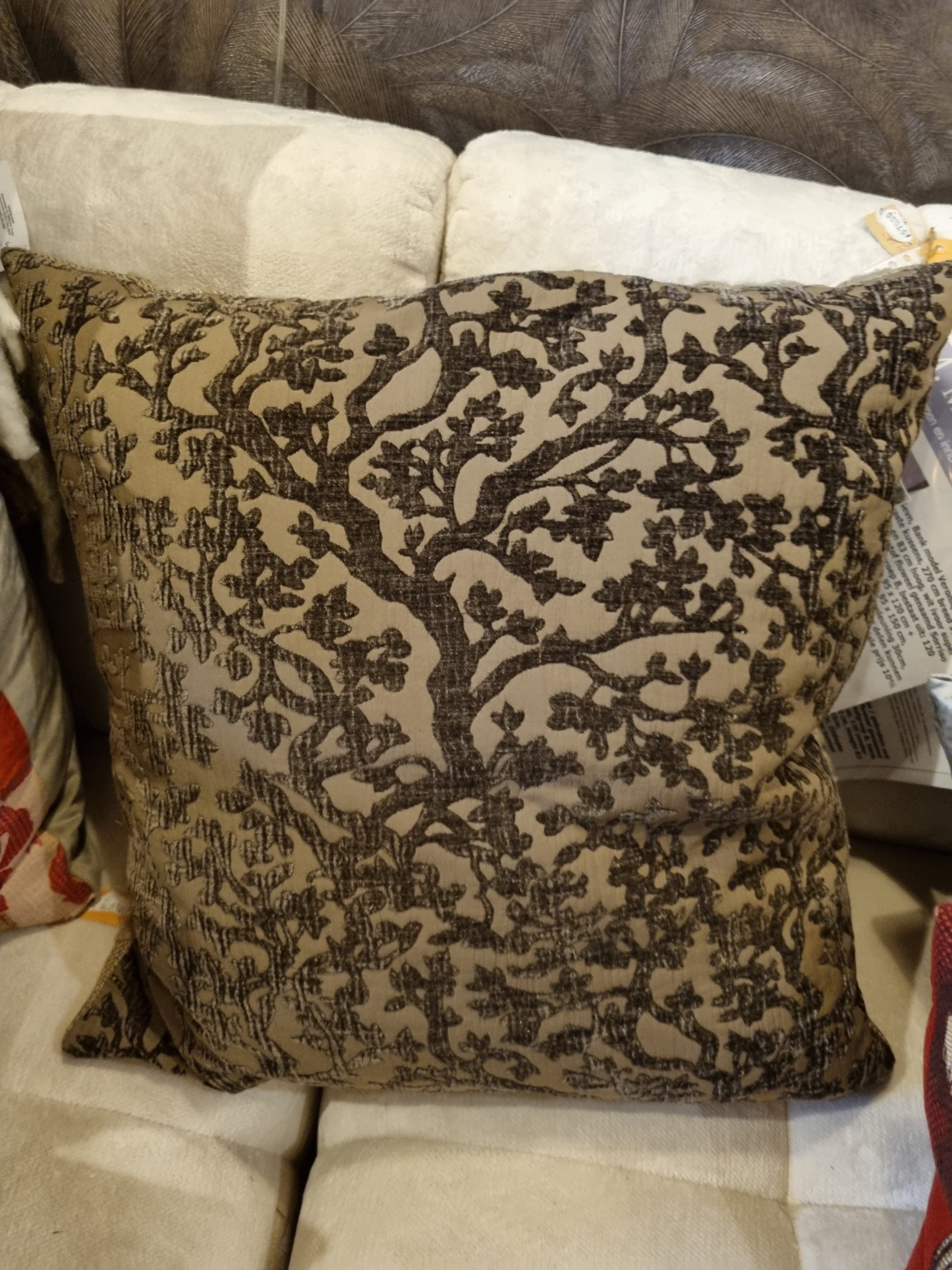 Bruin kussen met takken en bladeren fluweel 60×60cm vierkant, M.M. Metamorphosis hand werk, de achterkant taupe linnen met bladeren, prijs incl. binnen kussen (op voorraad) V1