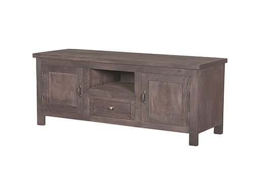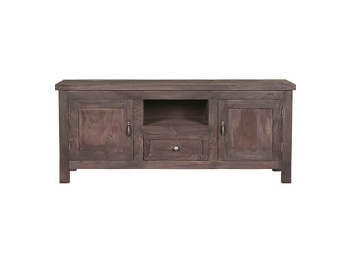 Bruin massief hout tv televisie wand meubel kast dressoir, Hoogendam Interiors by Mooss, : 2 deurs links en rechts met in het midden een voorzien open deel en lade 1.25 lang 56 hoog en 41 diep v0