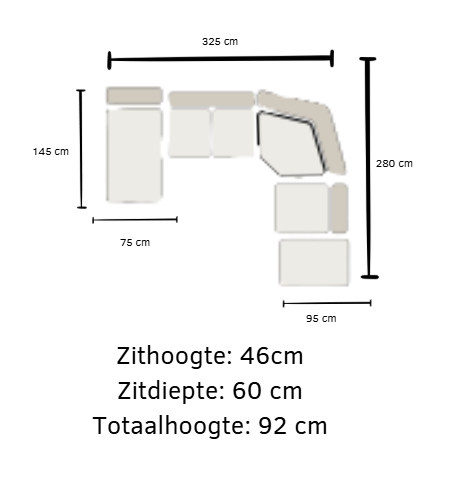 De zithoogte: 46 cm, zitdiepte: 60 cm, totaalhoogte: 92 cm,