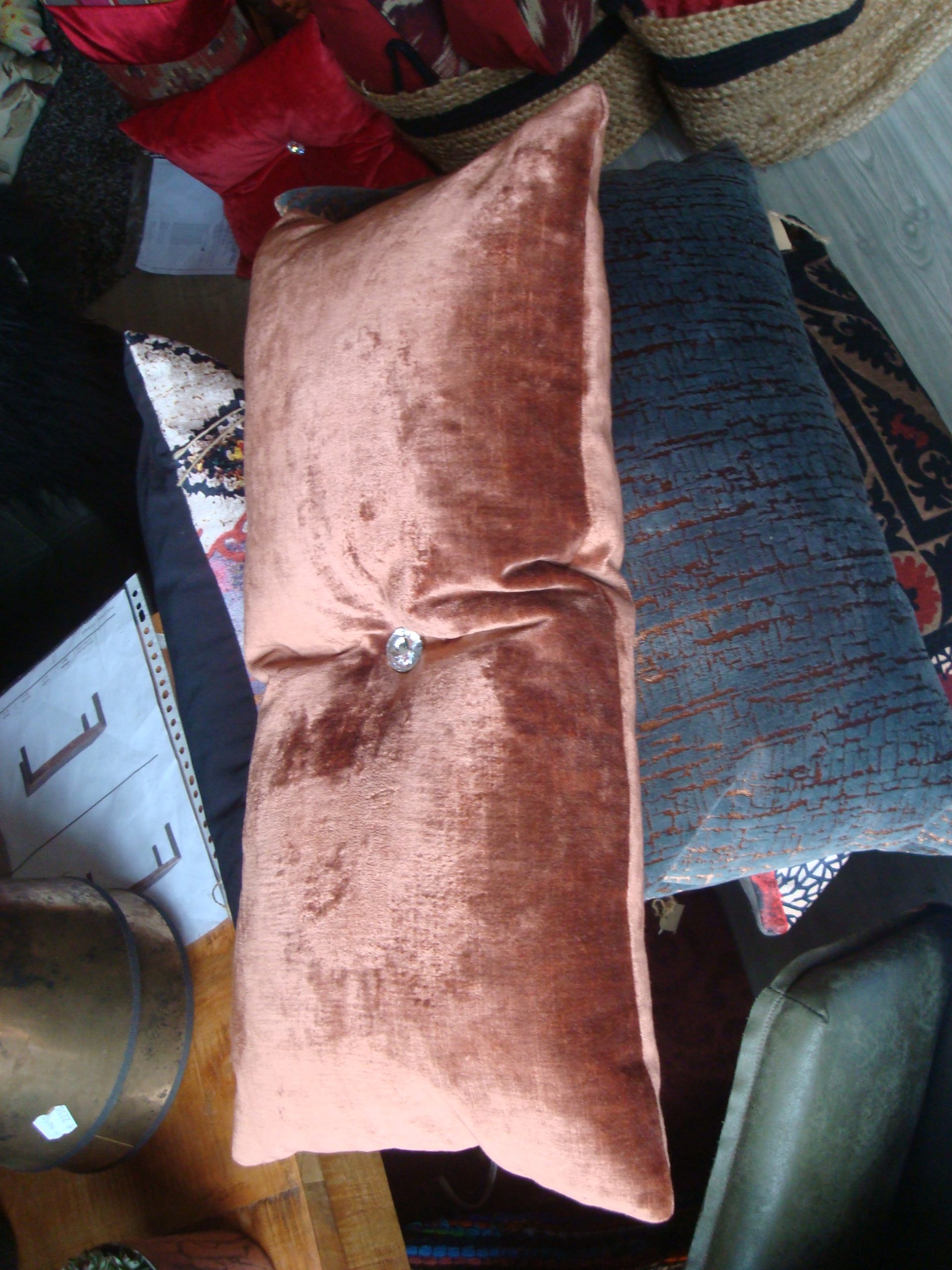 Bruin brons roest kussen 30x60cm langwerpig, Claudi, met binnen kussen van fluweel beide zijde gelijke met capiton van steen svarovski (op voorraad) V2
