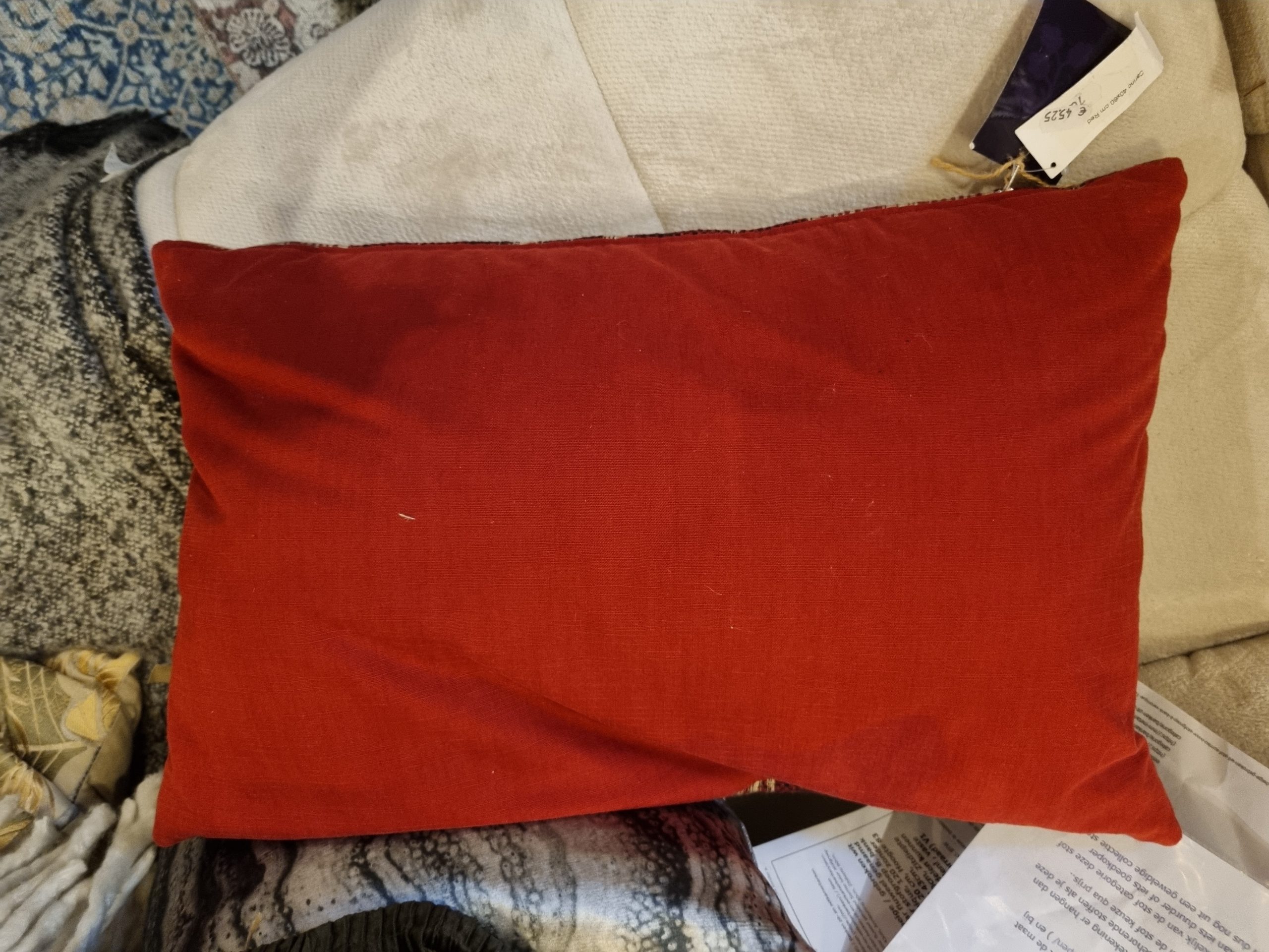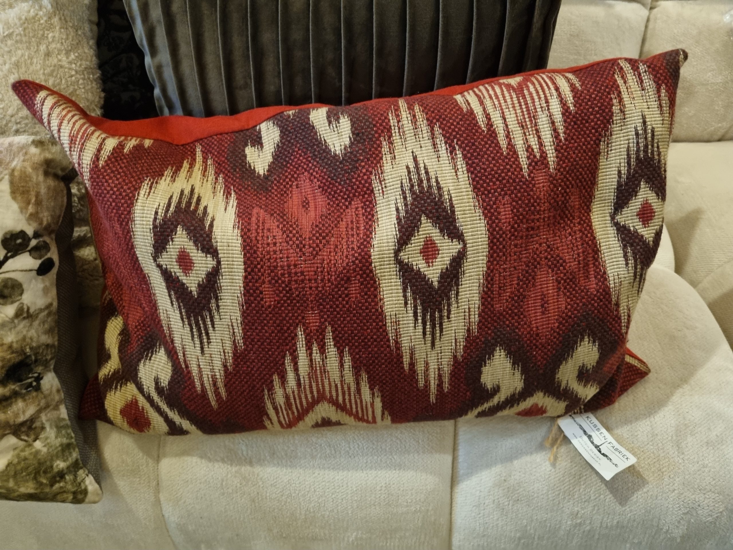 Rood bordeaux linnen kussen 40x60cm langwerpig, M.M. Metamorphosis Claudi De Kussenfabriek, binnen vulling met linnen prachtig motief voor en achterkant kussen effen rood bijpassend genaamd Carino red (op voorraad) V1