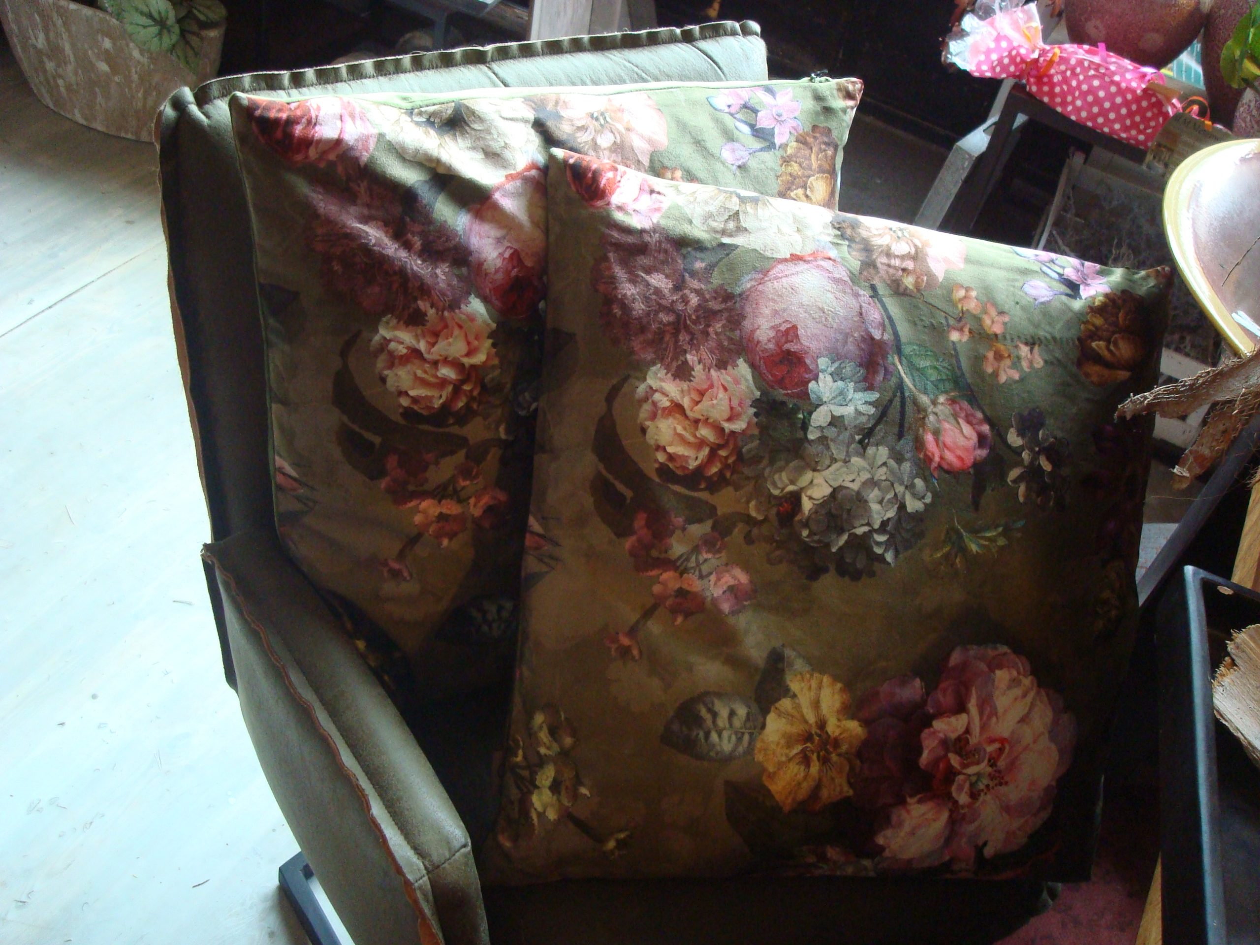 Groen kussen 50x50cm vierkant, Essenza, Fleur Cushion square Moss bloemen kussen met diverse tinten fluweel kussen met effen achterkant ( op voorraad ) V1