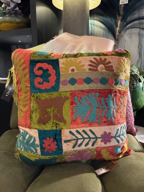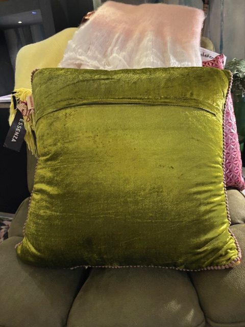 roze blauwe fluweel gemêleerd kussen 45x45cm vierkant, Imbarro, cushion Denize, achterkant groen, incl. binnen kussen ( op voorraad ) V1
