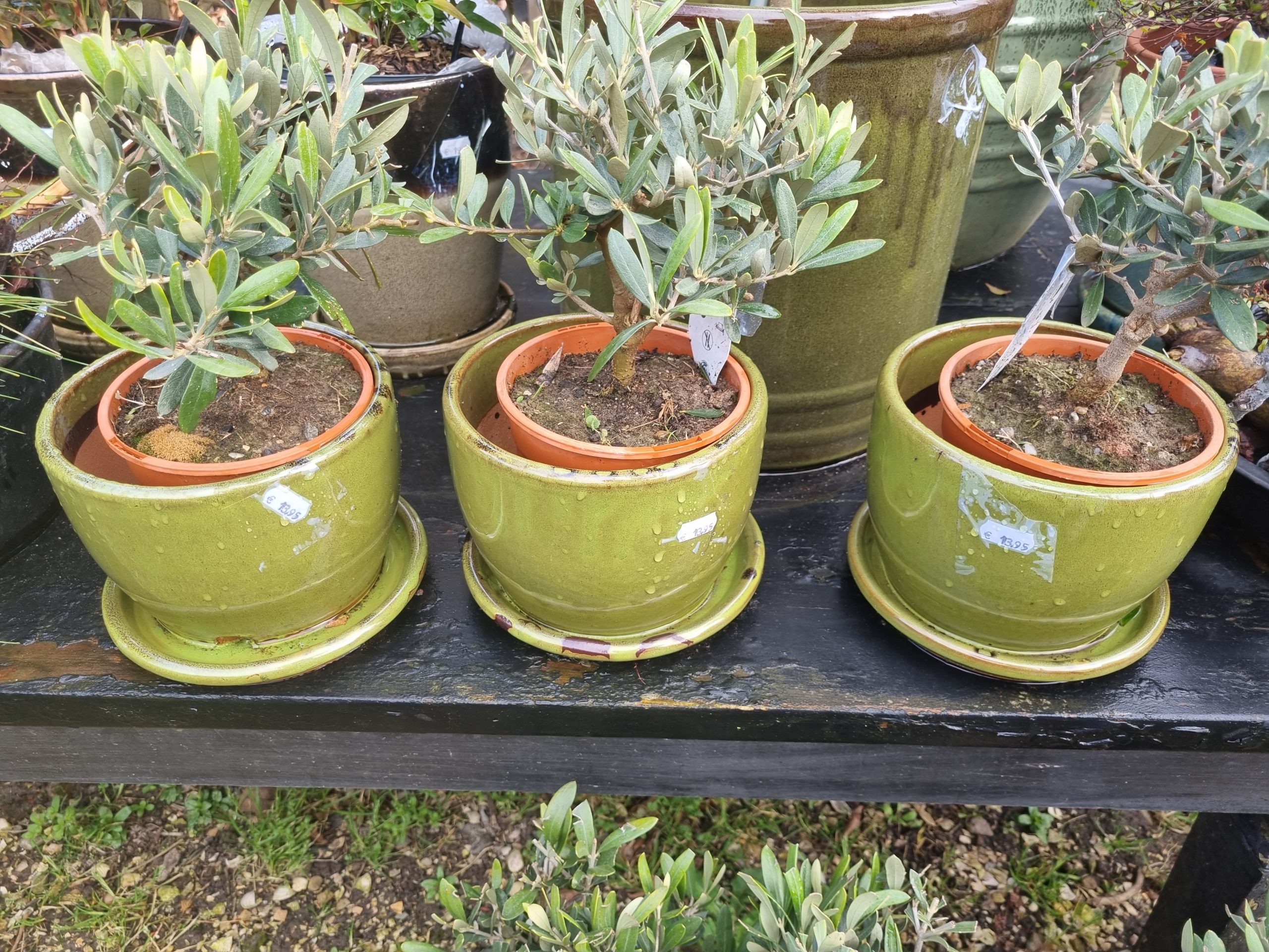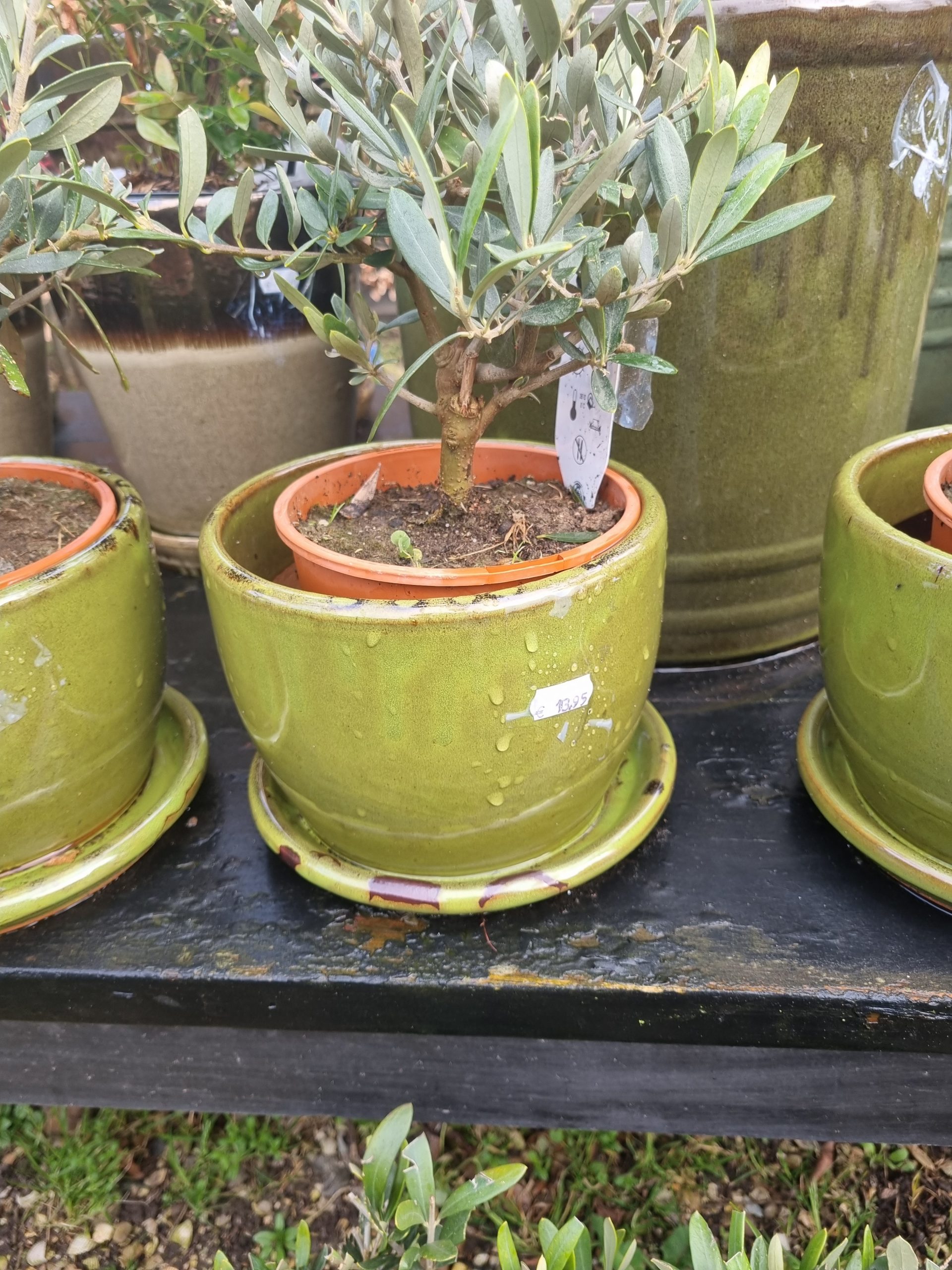 Groen aardewerk, Waterdrinker / Nieuwkoop, plant pot bloem vaas aardewerk geglazuurd kan ook buiten gebruikt worden met vaste schotel eronder, rond Ø18 x 14 hoog cm. (op voorraad) V6