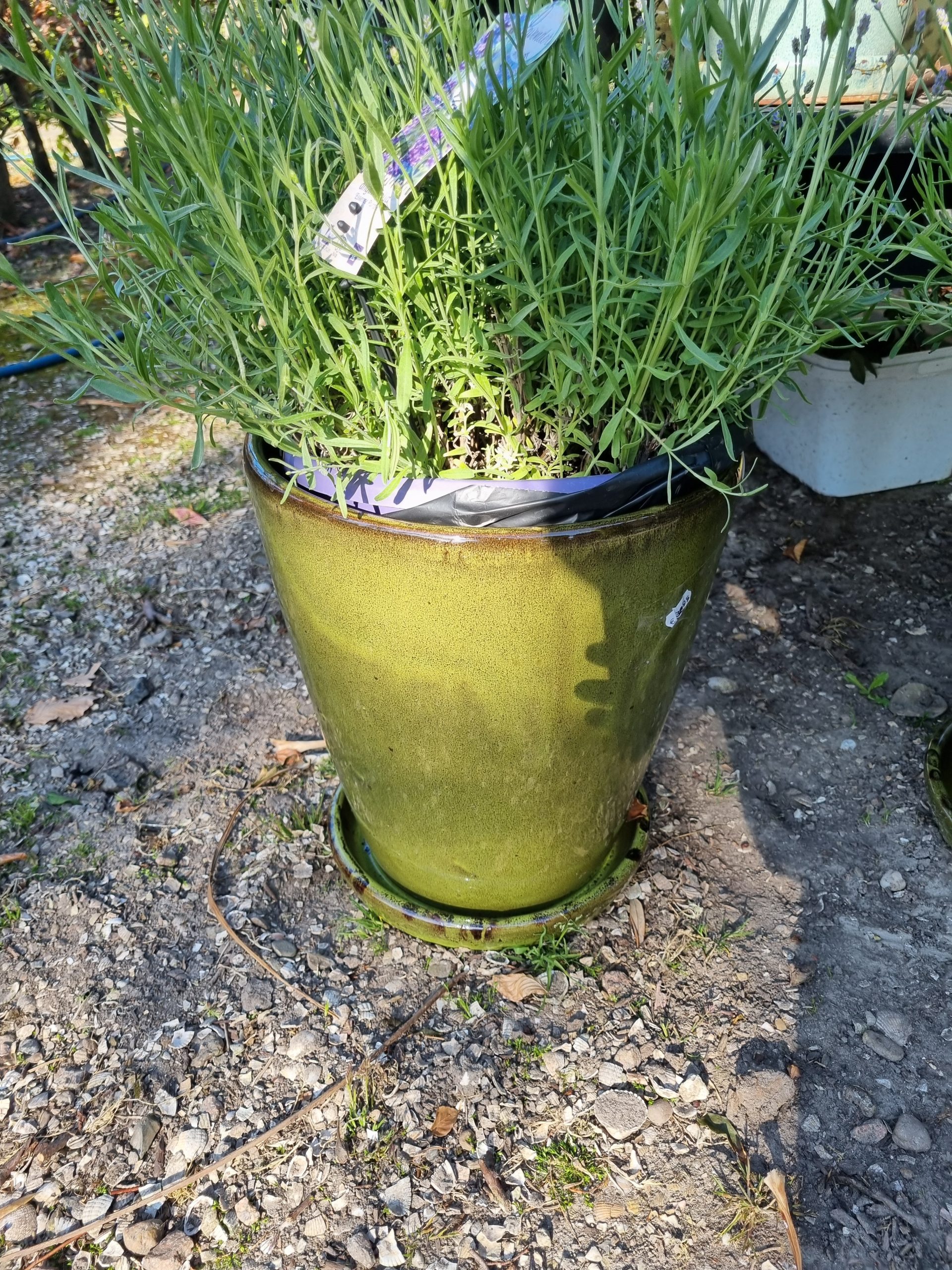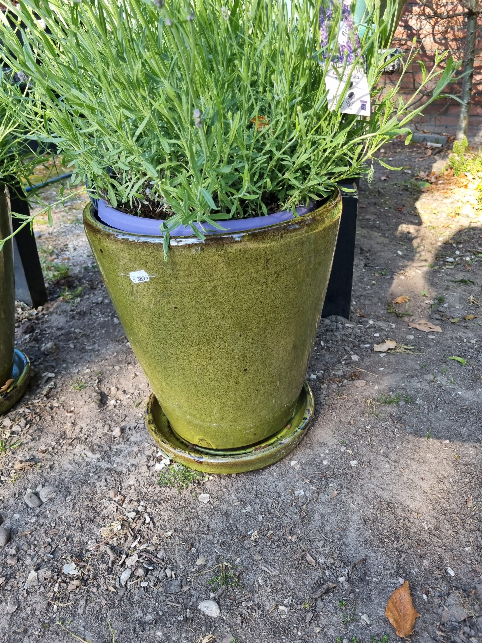 Groen bruin aardewerk geglazuurd plant pot bloem vaas, Waterdrinker / Nieuwkoop, kan ook buiten gebruikt worden met vaste schotel eronder, rond 30 x 35 hoog cm. (op voorraad) V2