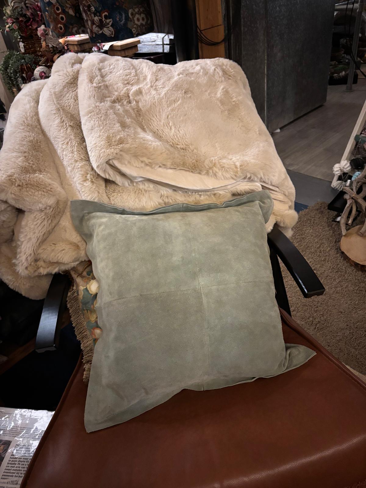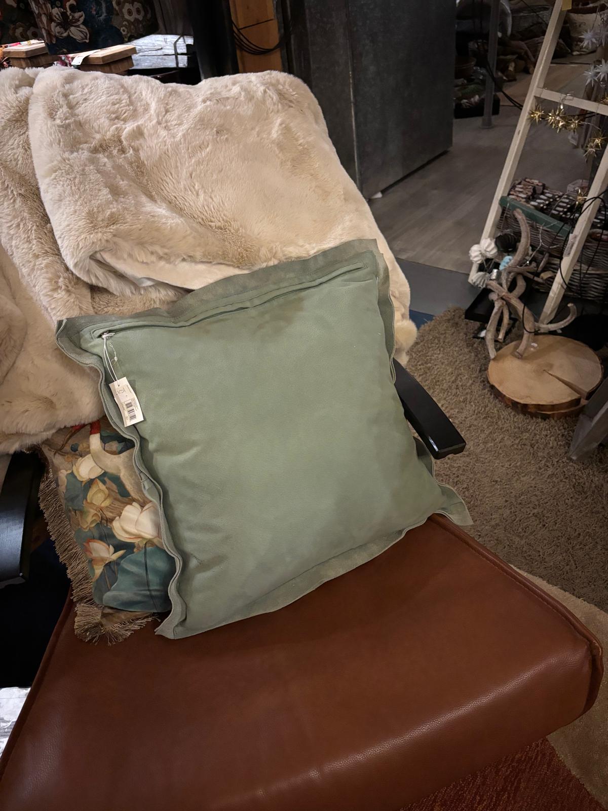 Groen suède kussen, 50x50cm vierkant, Goround, achterkant blauw fluweel, incl. binnen kussen ( op voorraad ) V1