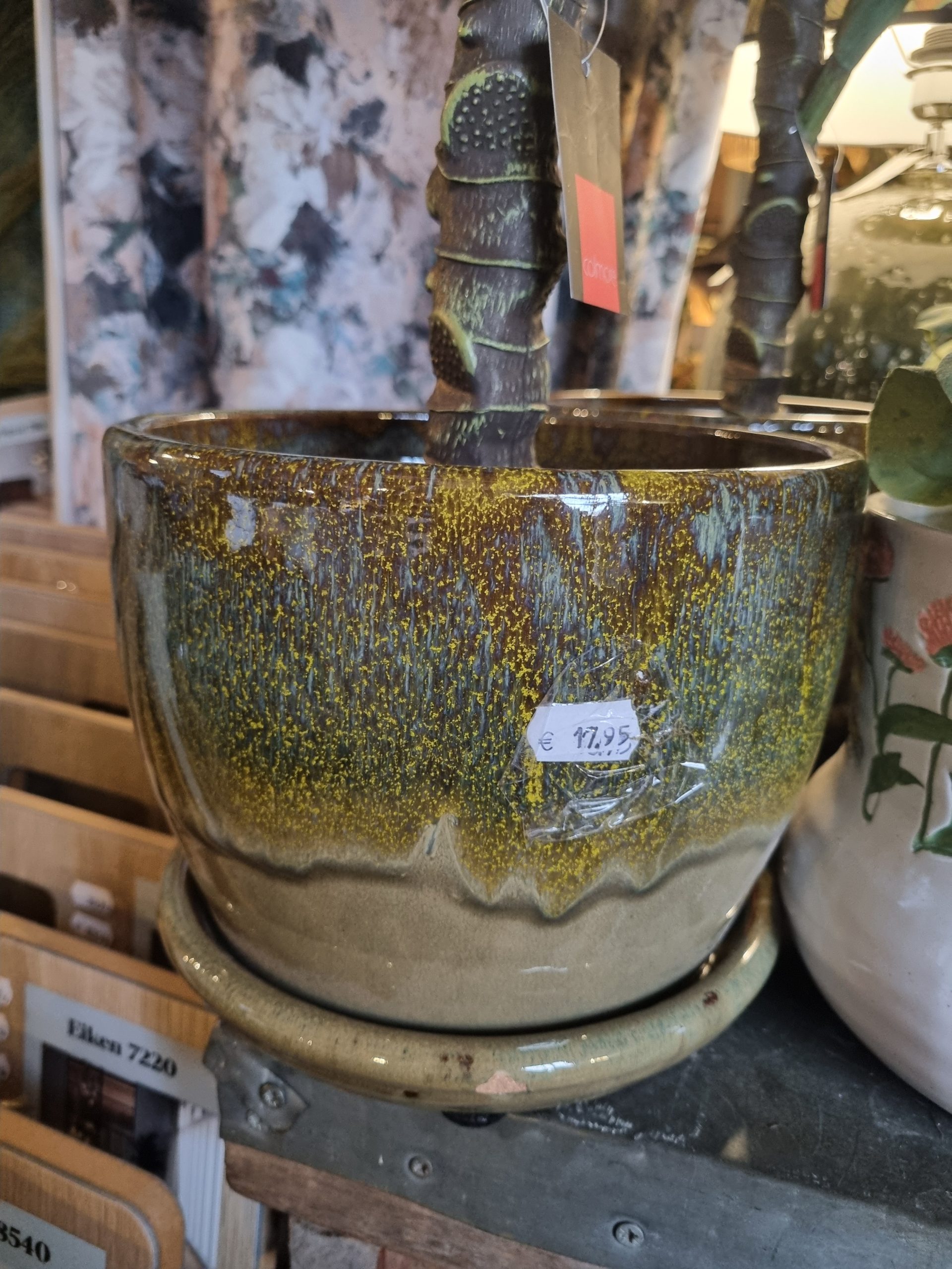 Groen geel gemêleerd aardewerk geglazuurd plant pot bloem vaas, Ter Steege, kan ook buiten gebruikt worden met vaste schotel eronder , rond Ø23 x 18 hoog cm. (op voorraad) V1