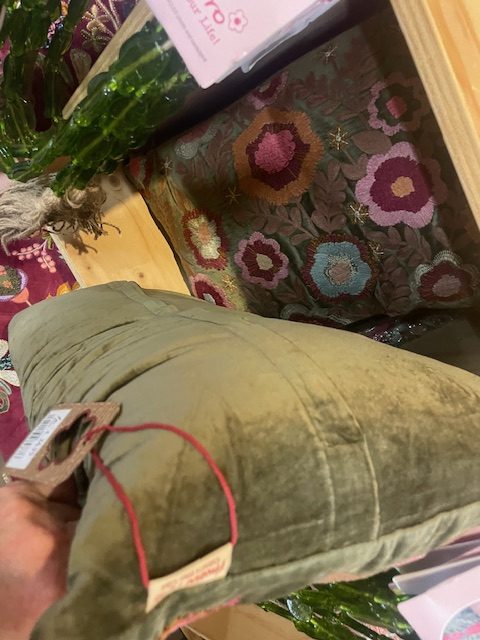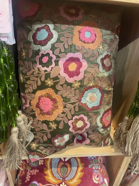 Groen roze oranje gemêleerd met geborduurde bloemen fluweel kussen 40x60cm lang, Imbarro, pillow Celine, achterkant fluweel groen, incl. binnen kussen ( op voorraad ) V2