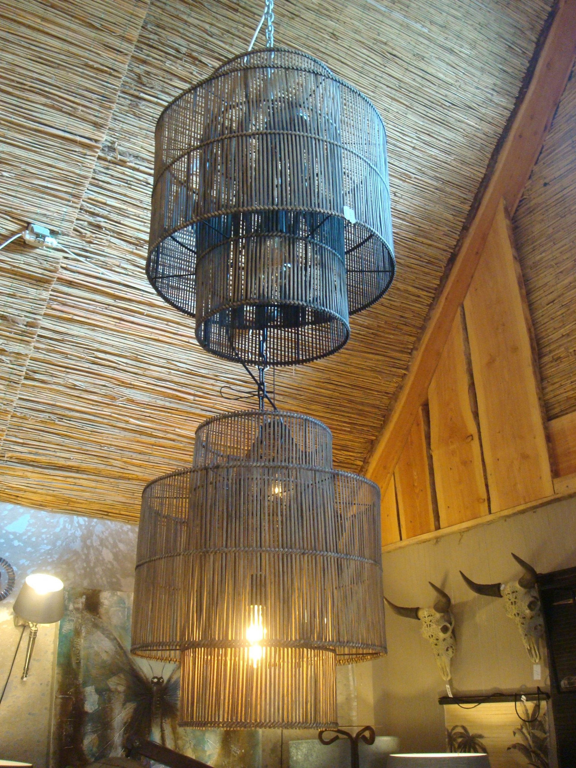 bruin rotan, Elzet, Hanglamp/lamp bamboe bruin grijs natuurlijk met zwart ijzeren frame ketting en plafond houder (op voorraad) v 1