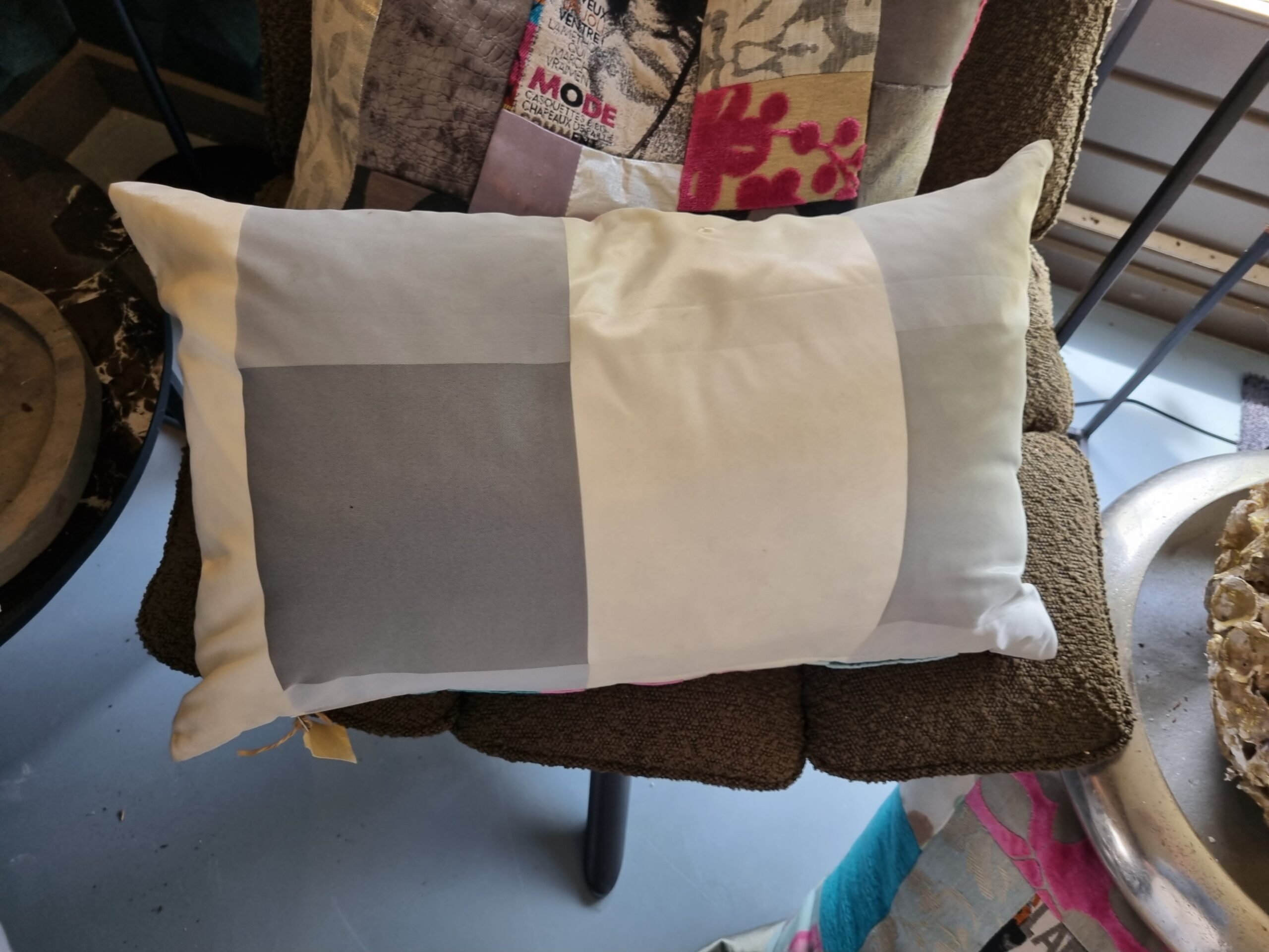 Roze blauw kussen stroken verticaal 40x60cm langwerpig, M.M. Metamorphosis, hand werk, de achterkant grijs en witte vlakken, prijs incl. binnen kussen (op voorraad) V1
