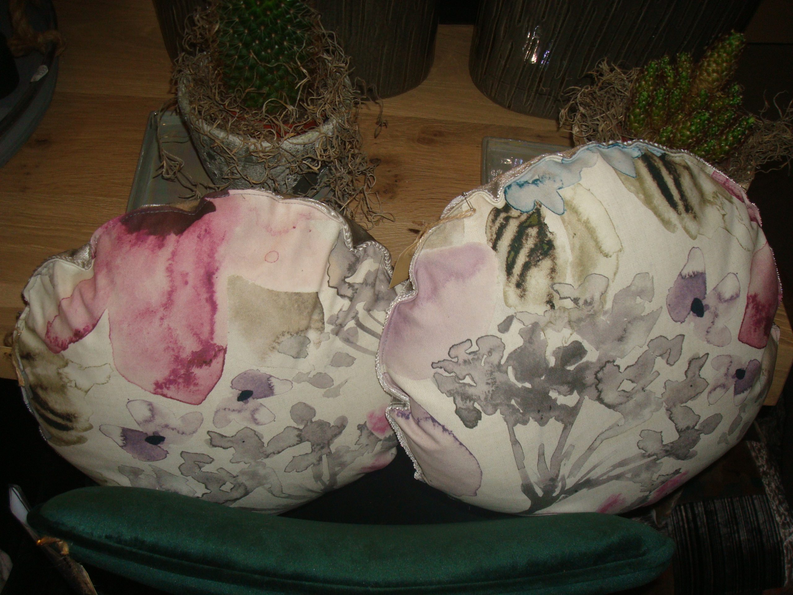 roze lila blauw kussen bloemen 40x40cm rond, M.M. Metamorphosis, gekleurd achterkant beige (op voorraad) V2 zie foto keuze mag