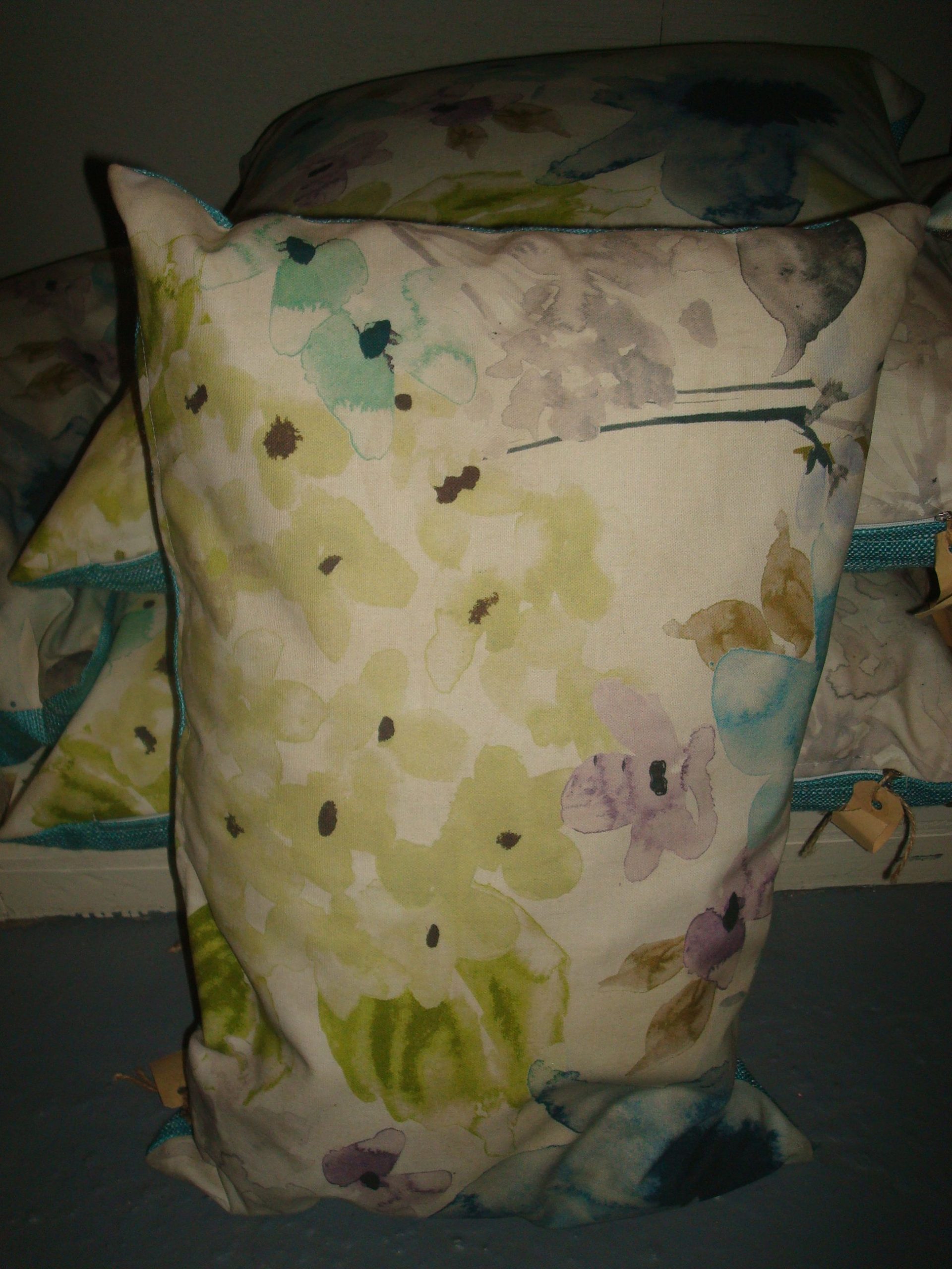 roze lila blauw kussen bloemen 40x60cm langwerpig, M.M. Metamorphosis, gekleurd achterkant blauw (op voorraad) V1