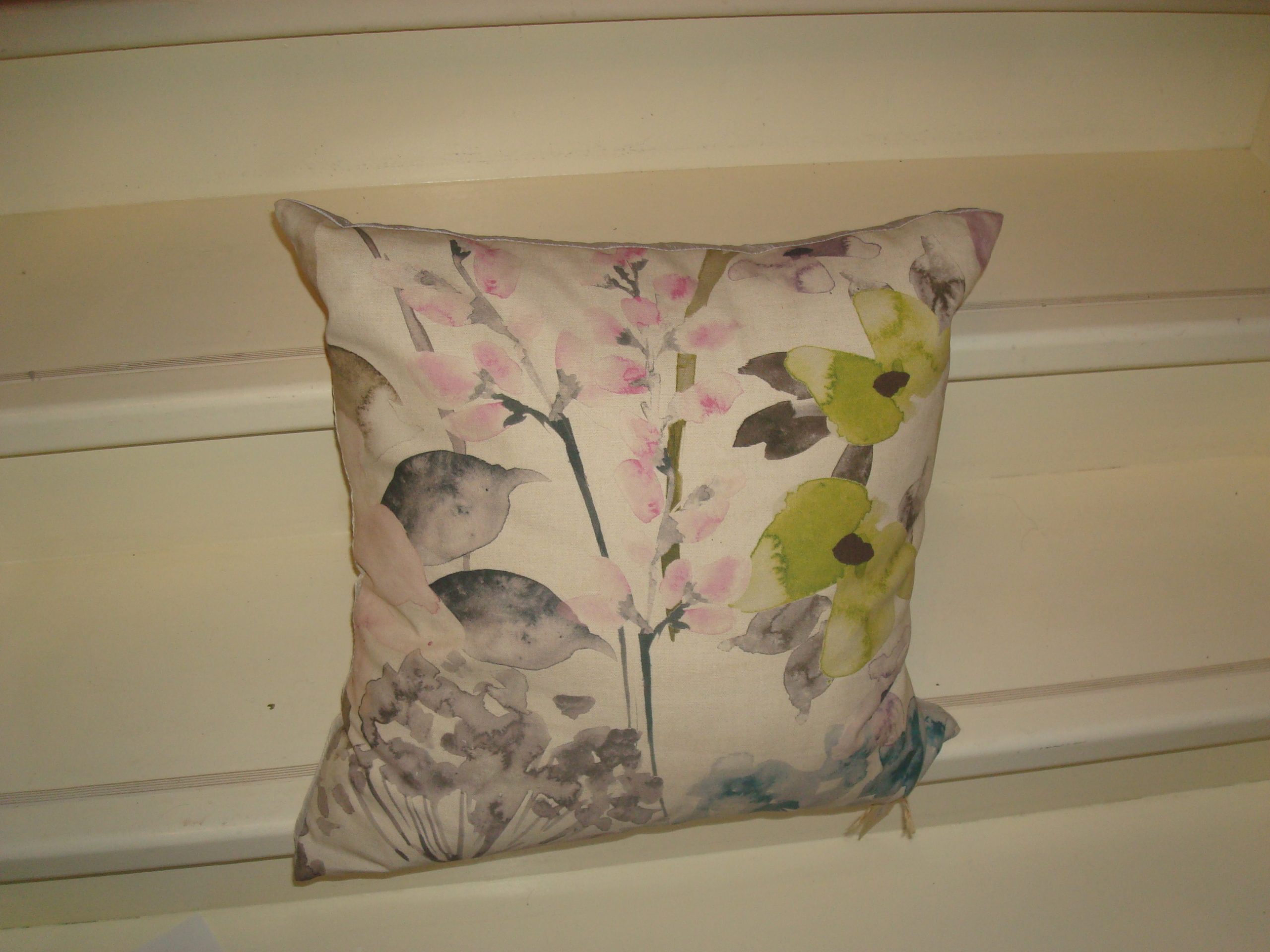 roze lila blauw kussen bloemen 45x45cm vierkant, M.M. Metamorphosis, gekleurd achterkant zilver (op voorraad) V1