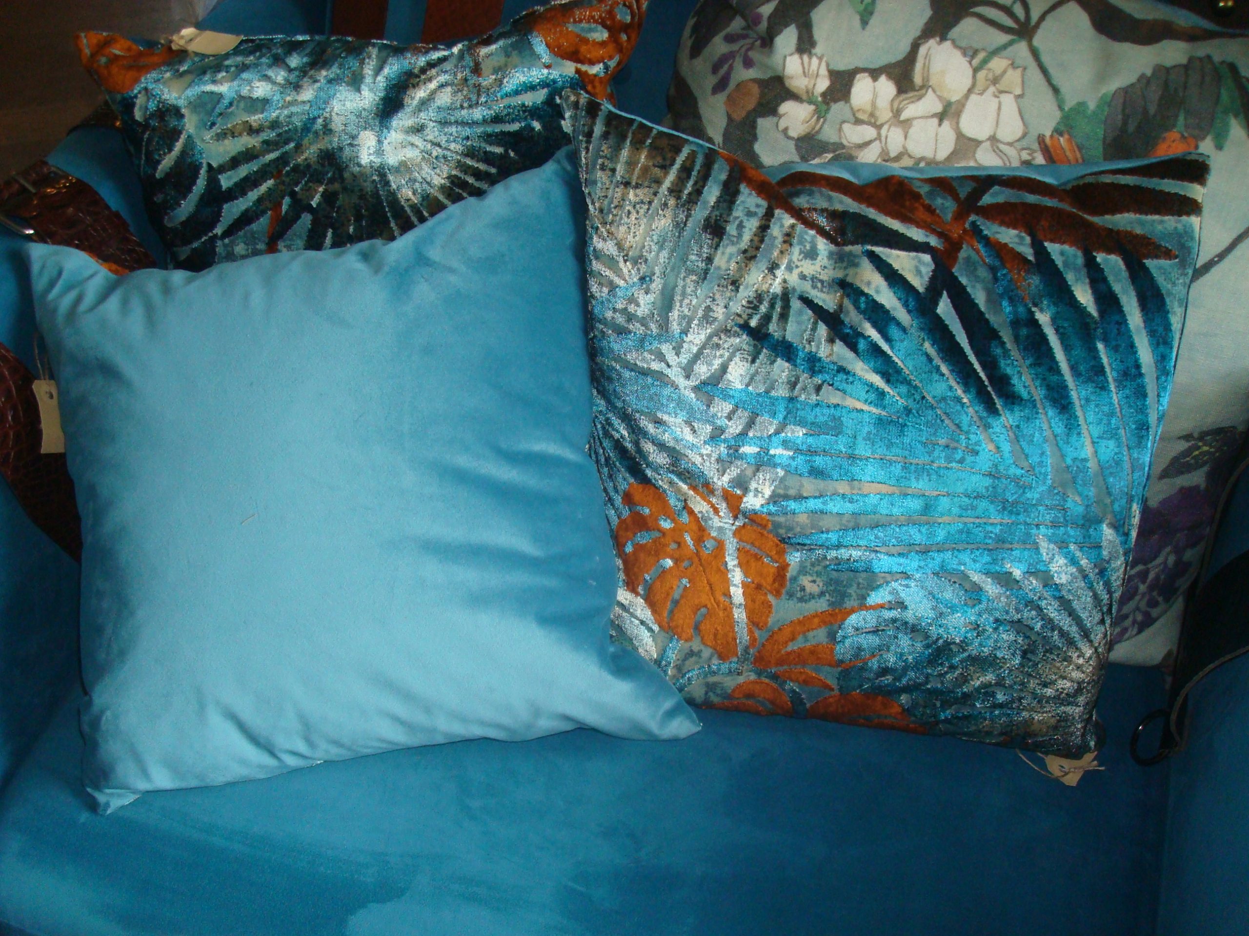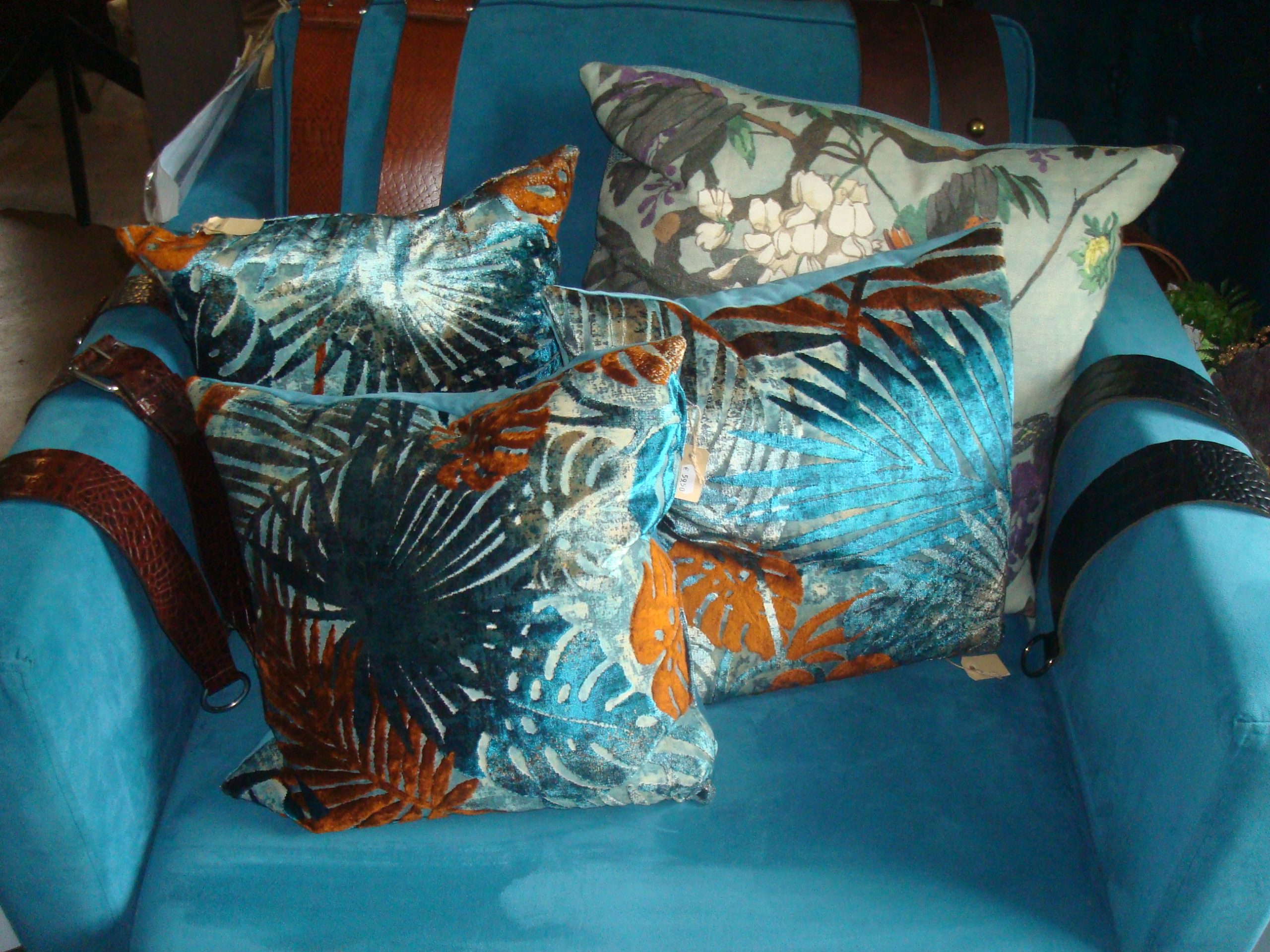 Blauw bruin kussen 45x45cm vierkant, Silvera, fluweel bladeren glans apart meerdere tinten met licht inval prachtig de achterkant blauw incl. binnen kussens ( op voorraad) V1
