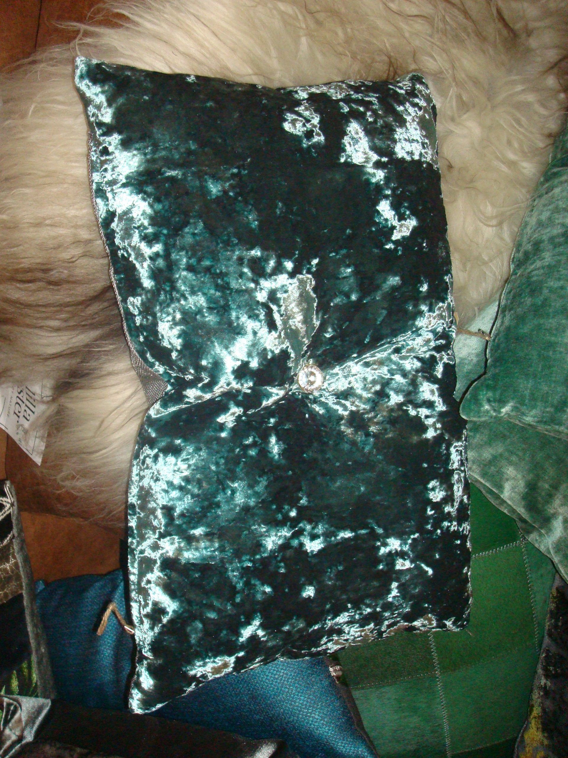 Groen turquoise kussen 40x60cm langwerpig, Claudi, met binnen kussen van fluweel en beide zijde gelijk met capiton van steen (op voorraad) V1
