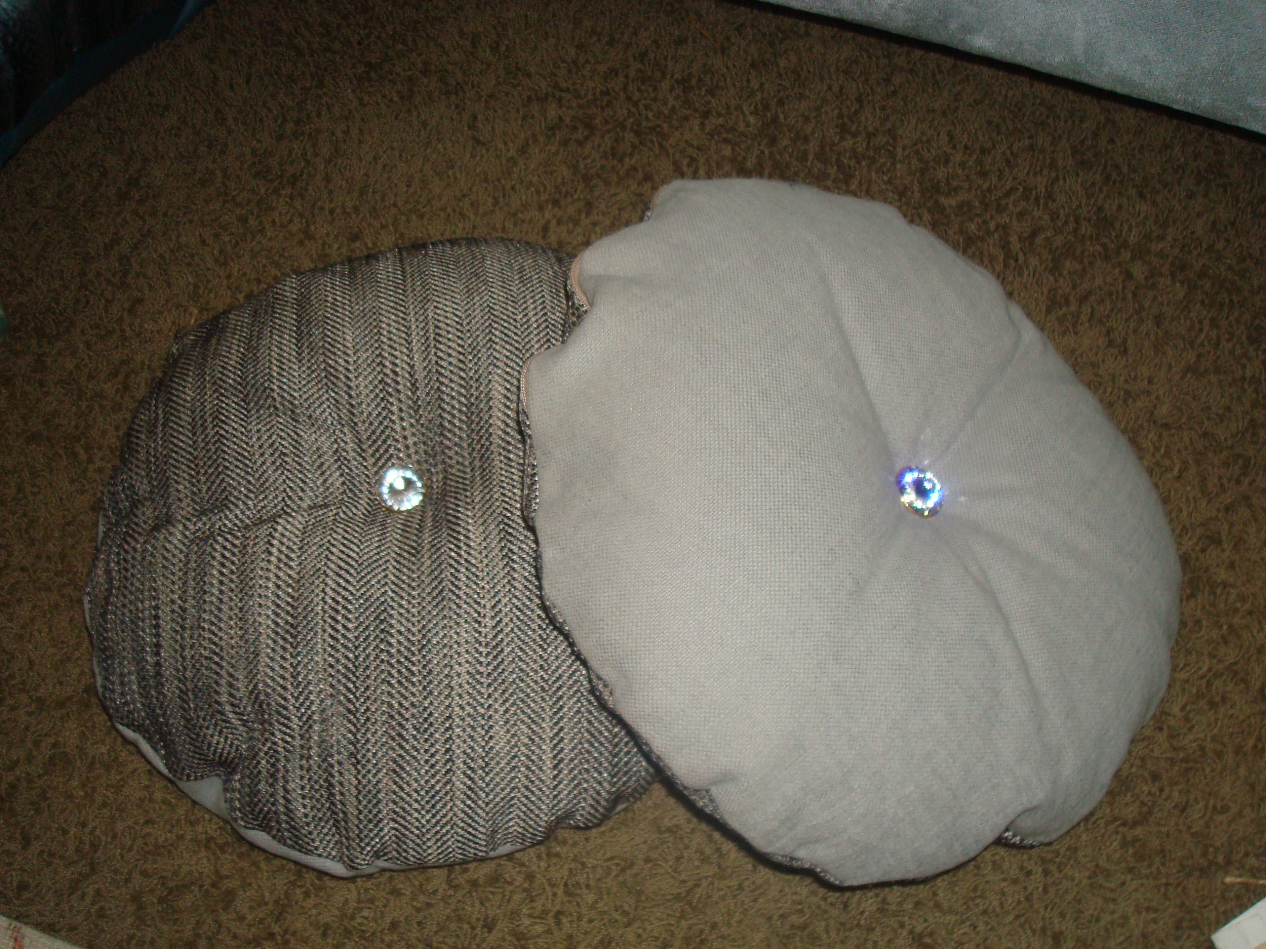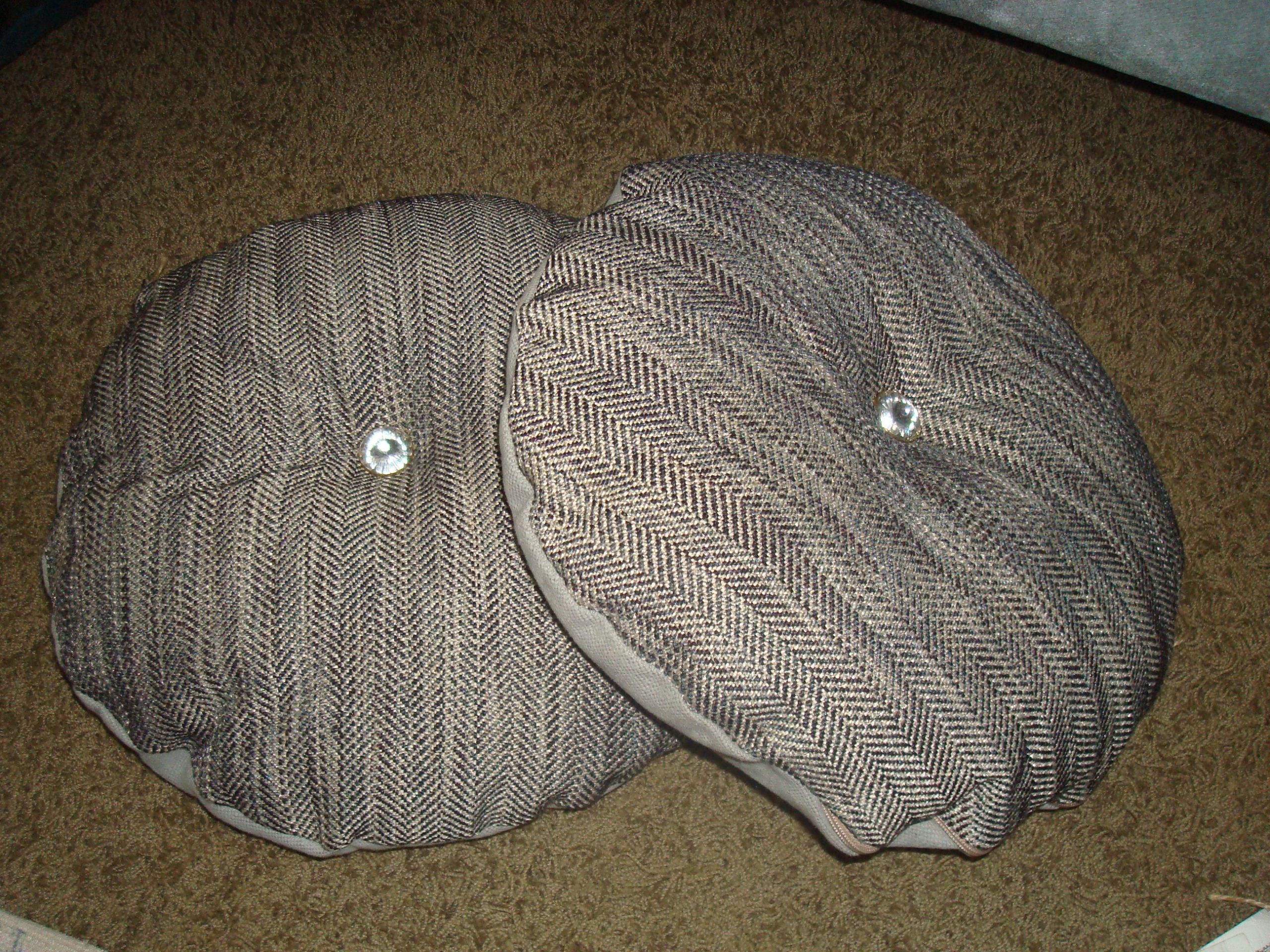 grijs kussen 45x45cm rond, M.M. Metamorphosis, grover linnen structuur rond kussen met vulling met capiton rond (op voorraad) V1