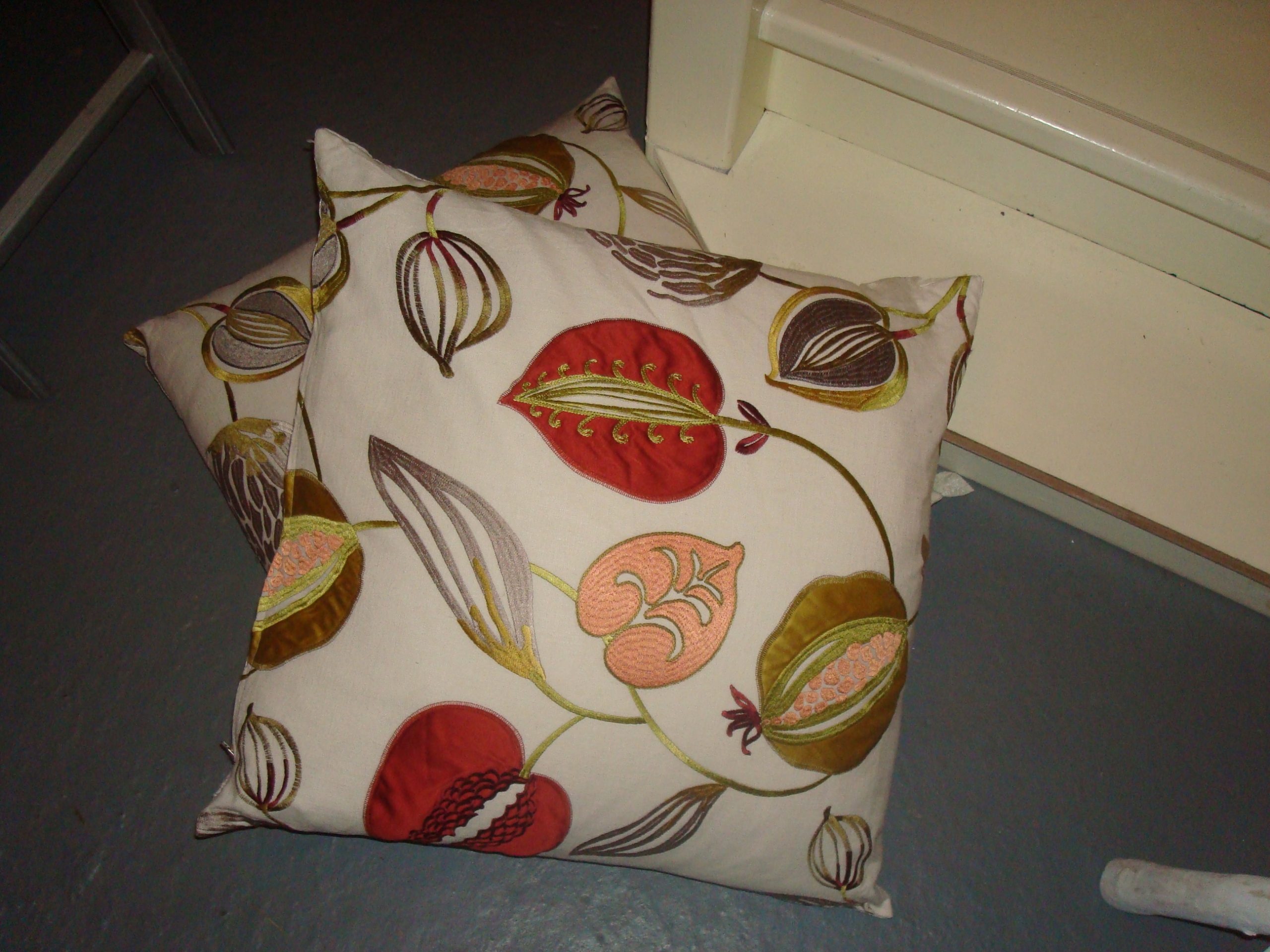 Bruin roze groen kussen met geborduurde bloem 45x45cm vierkant, Claudi, incl. binnen kussen (op voorraad) V1