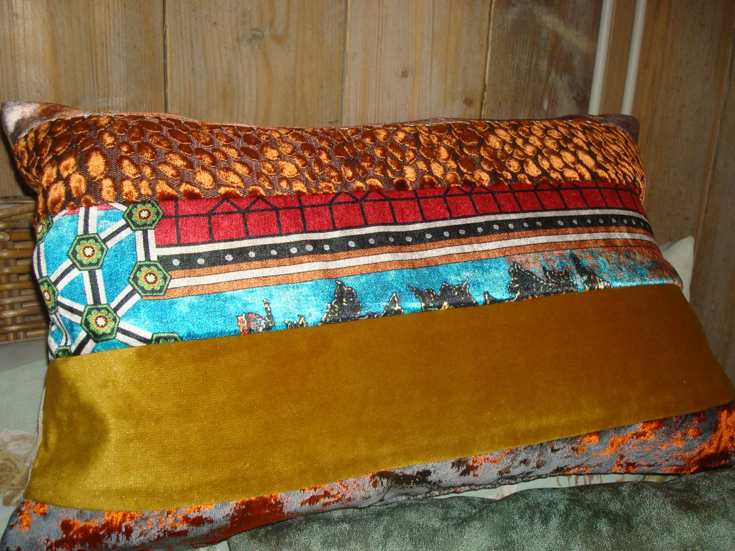 Oranje bruin turquoise kussen 40x60cm langwerpig, M.M. Metamorphosis, stroken handwerk horizontaal de achterkant beige (op voorraad) V1
