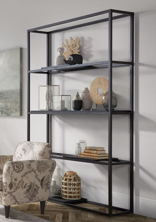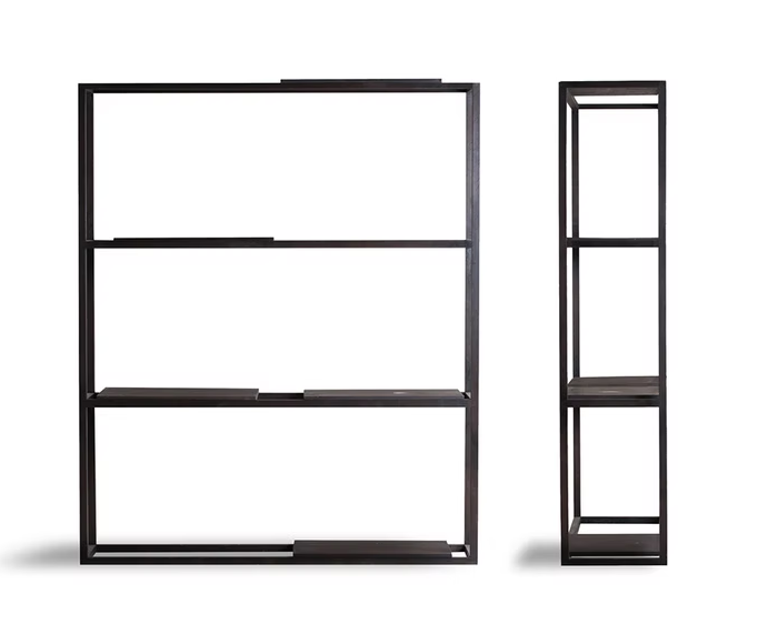 zwart mat eiken wand rek roomdivider boekenkast, Meubitrend, Etnic 1.50cm lang 181 cm hoog en 40cm diep: bestaat uit 4 grote losse planken die vast eiken hout frame liggen hier door zijn de planken te veranderen (op voorraad) V1