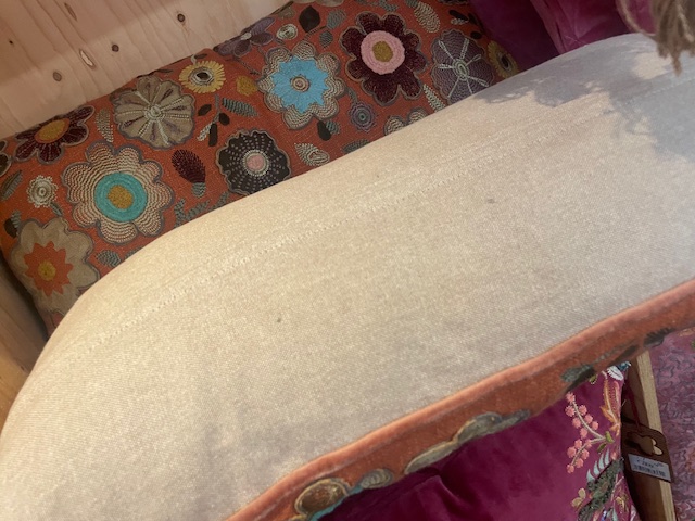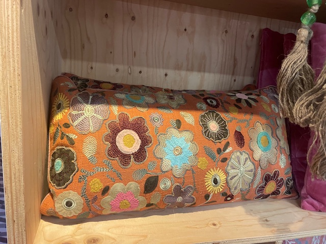 Oranje gemêleerd met geborduurde bloemen fluweel kussen 40x70cm lang, Imbarro, pillow Elodie, achterkant fluweel groen, incl. binnen kussen ( op voorraad ) V2