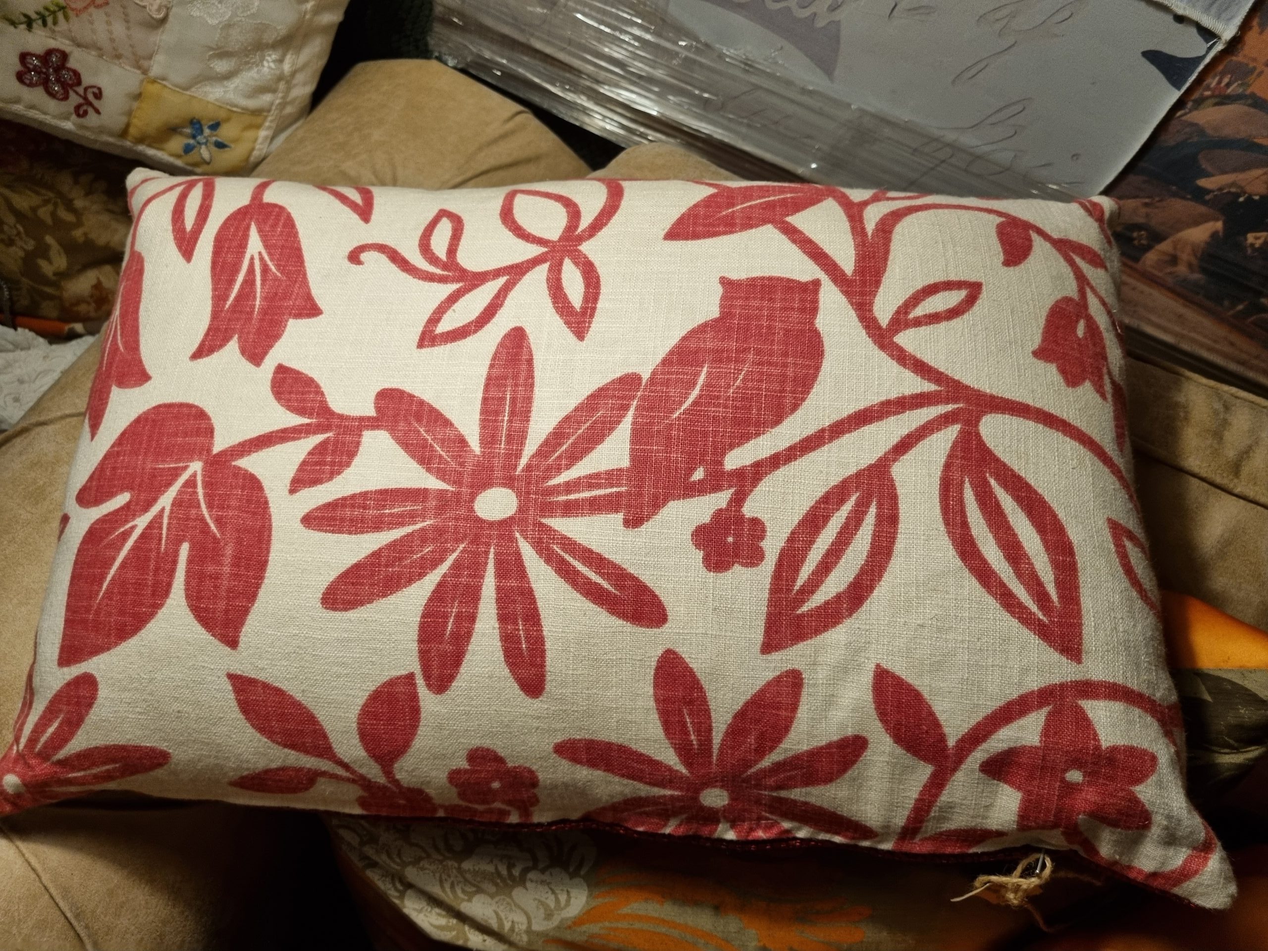 Rood roze beige met bloemen, handwerk kussen 40×60 cm langwerpig, M.M. Metamorphosis, achterkant rood incl. binnen kussen (op voorraad) V1