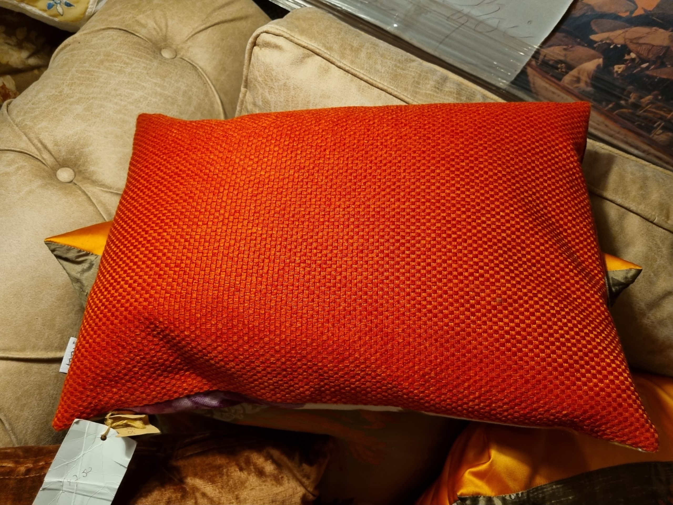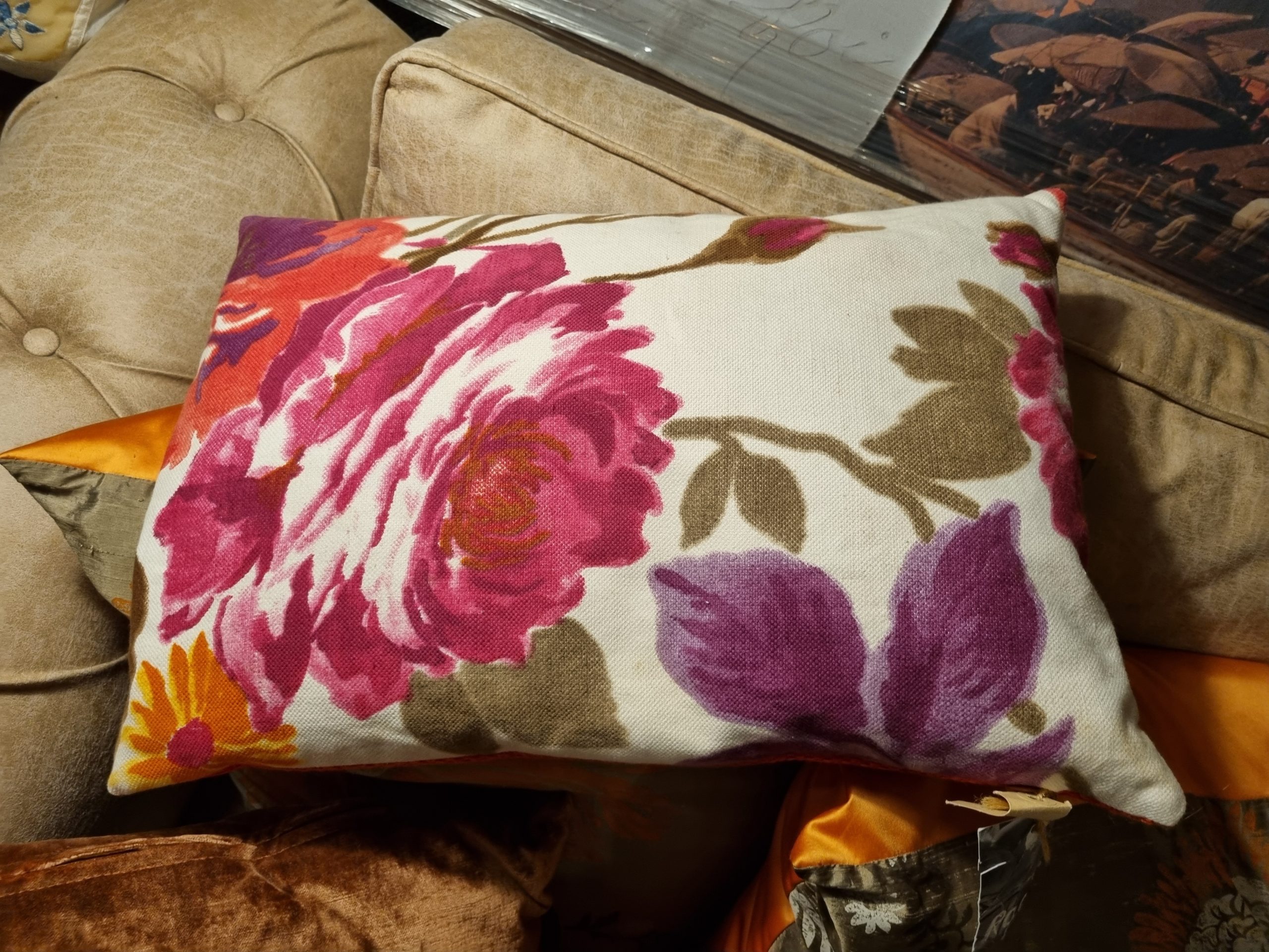 Rood roze paars met bloemen, handwerk kussen 40×50 cm langwerpig, M.M. Metamorphosis, achterkant rood incl. binnen kussen (op voorraad) V1