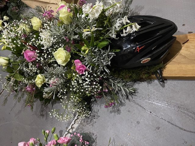 Rouwarrangement met verse bloemen op eigen voorkeur, M.M. Metamorphosis, op aanvraag kan hij helemaal naar u wens gemaakt worden met accessoires etc. V0