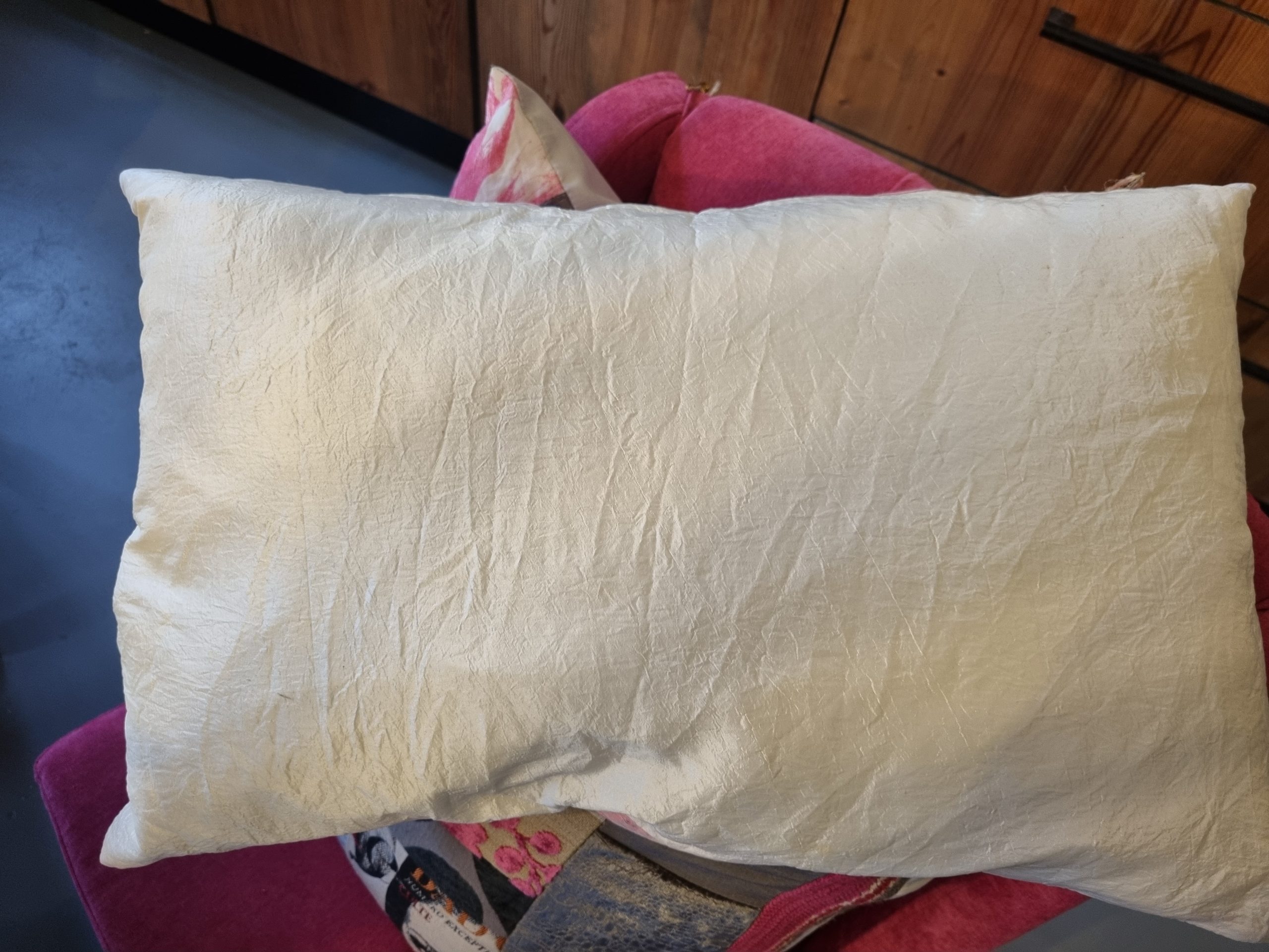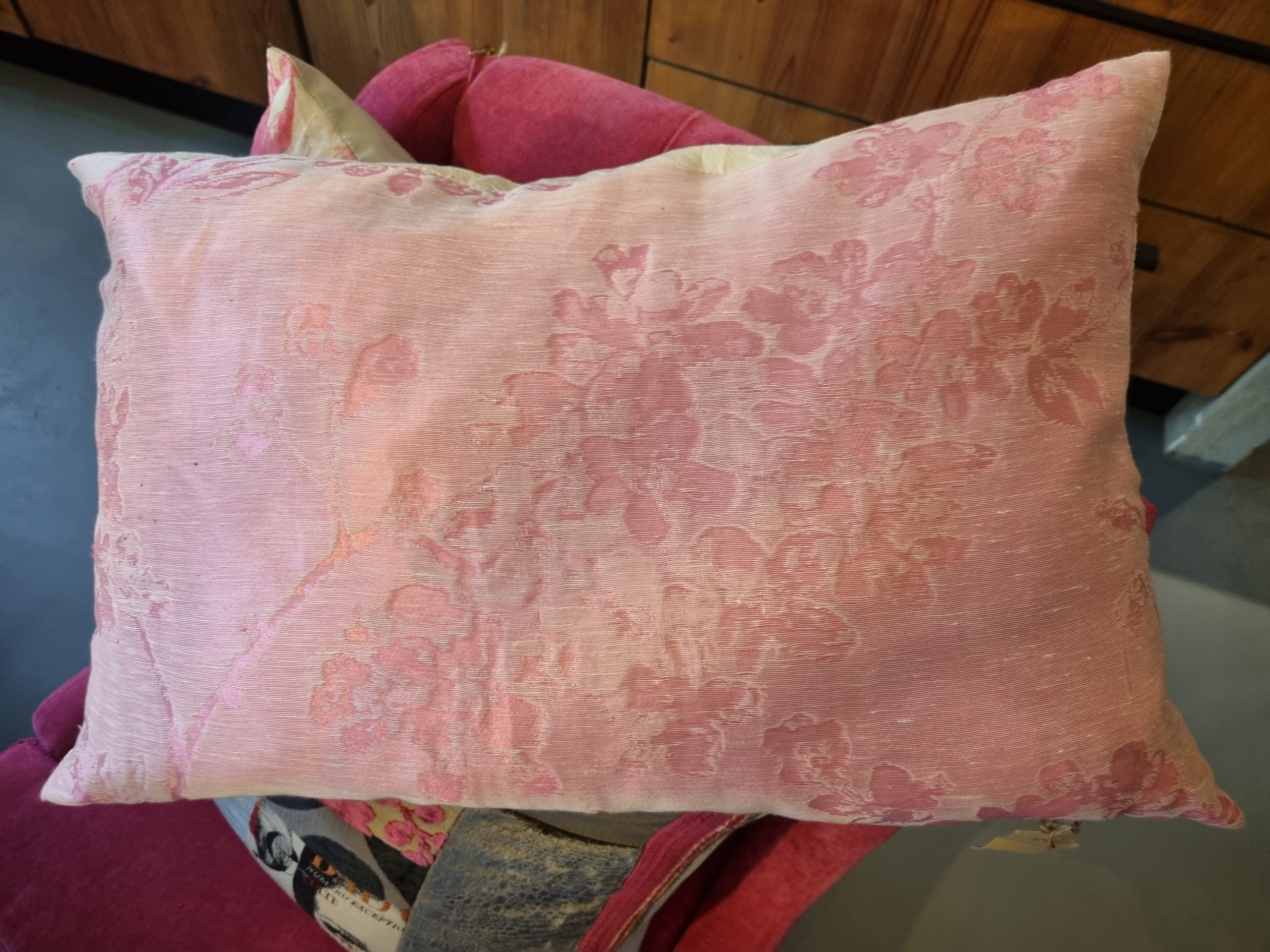 Roze glans kussen met bloemen 40x60cm langwerpig, M.M. Metamorphosis,hand werk, de achterkant beige , prijs incl. binnen kussen (op voorraad) V1