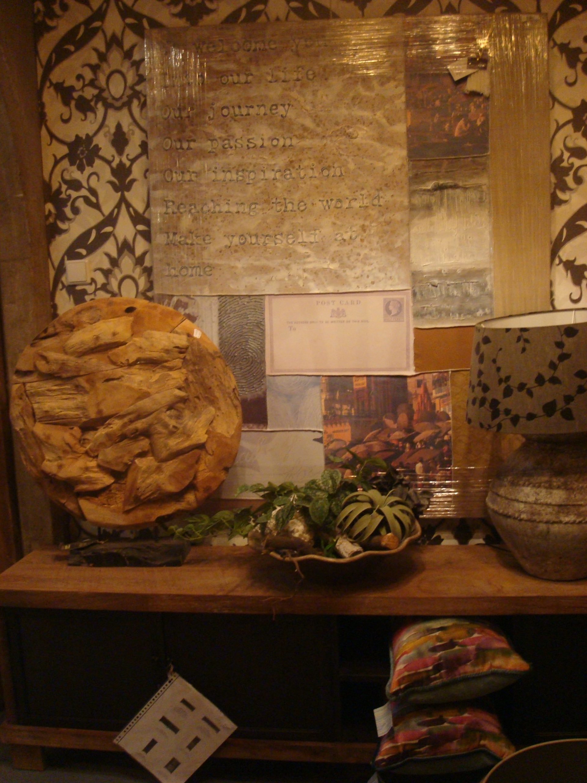 bruin beige met verschillende structuren en materialen schilderij kunsterk. Sabine Kleiren, van een Nederlandse award winning kunstenares uniek schilderij doek1.50 hoog bij 1.20 breed met echte producten erop verwerkt als stof ed. post card genaamd (op voorraad) v 1
