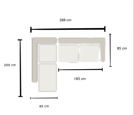 De bank bestaat uit 2 delen : Deel 1: zithoek+ottomane links (rugdeel met eiland) ( long island) : 2 m lang en 85 cm diep, Deel 2: 3 zits arm rechts: 85 cm diep en 1,83 m lang,