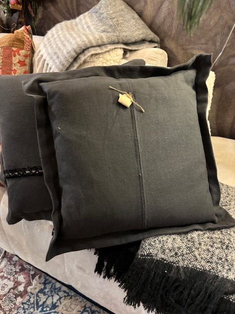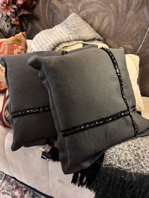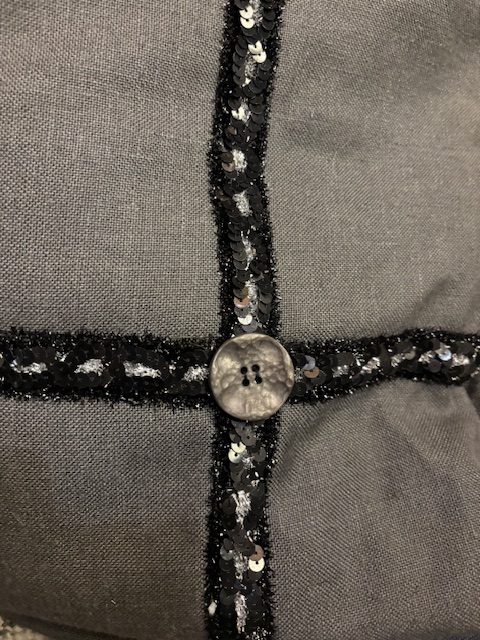 Zwart, grijs linnenlook stof kussen, met een mooi glitter band, 60x60cm vierkant, M.M Metamorphosis, incl. binnen kussen ( op voorraad ) V2